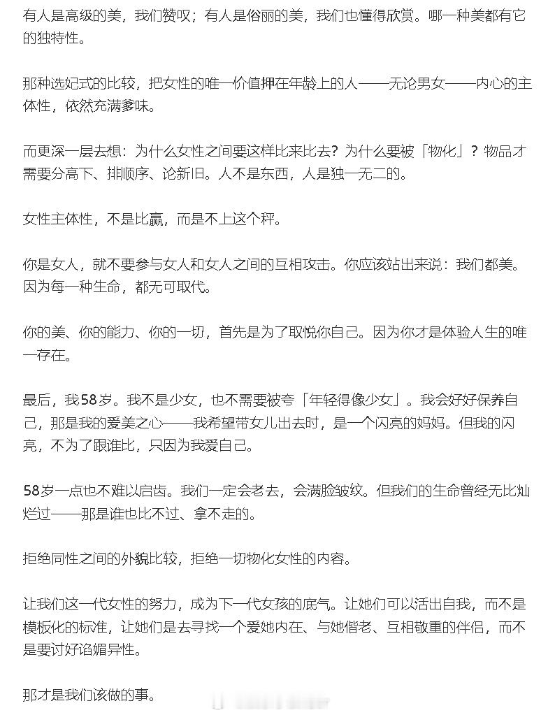 伊能静说别再雌竞了伊能静 我不需要被夸年轻得像少女 26日晚,发长文:“别再雌竞了”,她说每次参加完活动,总会看到各种女性之间被相互比较,几乎没见过男性这样去讨论同性的外貌。“你是女人,就不要参与女人和女人之间的互相攻击。”伊能静还称自己不是少女,也不需要被夸“年轻得像少女”:“58岁一点也不难以启齿。”