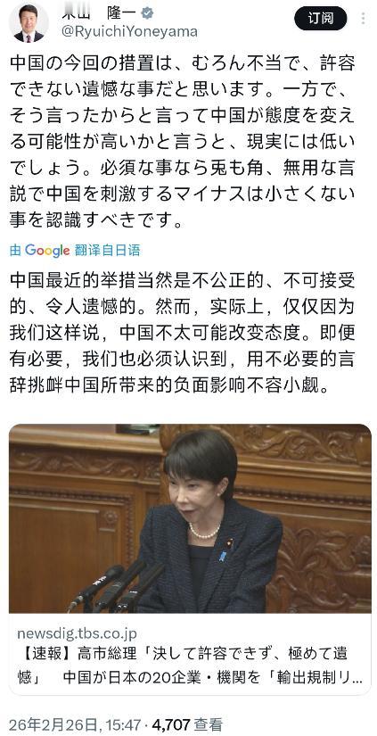 日本前众议员、前新潟县知事米山隆一今天(2月26日)写道:“我认为中国此次的举措无疑是不当的,也是令人遗憾、无法接受的。但另一方面,即便如此表态,中国改变立场的可能性在现实中想必也很低。我们理应认识到,若是必要的表态倒也罢了,用不必要的言辞挑衅中国所带来的负面影响不容小觑。”   米山隆一作为日本前众议员、前新潟县知事,2月26日的这番表态确实值得琢磨。他口中“无法接受”的中国举措,咱先把事儿说清楚,可不是凭空来的。   中方2月24日正式实施的出口管制公告,明明白白针对的是两类日本实体:20家参与提升日本军事实力的企业被列入管控名单,20家无法核实两用物项最终用途的实体进入关注名单。   这一举措有明确的法律依据,完全是按照《中华人民共和国出口管制法》等法规执行。中方外交部和商务部都已经说得很清楚,这么做的核心目的是制止日本“再军事化”和拥核企图,维护国家安全的同时也履行防扩散的国际义务。米山隆一觉得中方举措不当,其实是没看到日本近期在军事领域的一系列动作。高市早苗政府上台后,不仅通过了创纪录的防卫预算,还在推进“安保三文件”修订,目的就是打造所谓“反击能力”,让日本摆脱和平主义立场。   被列入管控名单的三菱造船、川崎重工这些企业,可不是普通的制造业公司。它们一直在为日本生产舰船、战斗机、高超音速导弹这些进攻性武器,有些舰船还被用于钓鱼岛方向的侵权活动,甚至帮菲律宾建造南海相关舰船。中方切断这些企业的关键两用物项供应,就是精准遏制日本发展进攻性军力,这一点军事专家已经说得很透彻。   日本政府的反应倒是很快,内阁官房副长官佐藤启当天就称中方做法“绝对不可接受”,还提出了强烈抗议。但抗议归抗议,市场的反应骗不了人。公告发布当天,东京股市防卫和重型机械板块就遭抛售,三菱重工股价一度下跌3.6%,最终收跌3.1%,IHI株式会社和川崎重工的跌幅更是超过4%。这些企业现在都在忙着调查核实,它们心里清楚,中国的稀土和相关技术对它们的生产有多重要,日本70%的稀土进口都依赖中国,而镝、钇这些元素正是制造先进武器的关键。   米山隆一提到“中国改变立场的可能性很低”,这一点倒是说到了点子上。中方的举措不是一时冲动,而是对日本加速“再军事化”的针对性回应,也是1月相关原则性禁令的具体落地。事实上,日本庆应义塾大学的学者都看得明白,中方措施只针对军工相关实体,不涉及民用企业,已经体现了足够的克制和区别对待。   他后面那句“避免不必要的言辞挑衅”,确实算是理性的提醒。中日两国一衣带水,经贸往来密切,真要是因为无端挑衅把关系搞僵,对谁都没好处。日本地缘经济学研究所的专家也认为,中方这次更多是释放政治信号,只要企业能证明用途不涉及军事,还是能获得相关材料。但这前提是日本得收敛“再军事化”的脚步,不能一边扩充军力、生产进攻性武器,一边还要求中方无动于衷。   米山隆一作为日本政坛有过地方治理经验的人物,应该清楚地区和平稳定的重要性。他之前就曾在社交媒体上反讽过石平那种恶意抹黑中国的行为,看得出来不是极端右翼。但这次他说中方举措“不当”,确实有失偏颇。中方的所有动作都在法律框架内,针对的只是威胁地区安全的具体行为,而不是日本整个国家或普通民众。   日本现在的问题是,有些势力总想突破和平宪法的限制,跟着外部势力搞对抗。高市早苗政府推进的军事扩张,已经引起了周边国家的警惕。中方的出口管制,本质上是用合法手段维护地区平衡。米山隆一担心的“负面影响”,其实恰恰是日本某些势力挑衅行为可能引发的后果。如果日本能停止“再军事化”的步伐,尊重周边国家的安全关切,中日之间自然不会有这些摩擦。   说到底,国家之间相处,讲究的是相互尊重。中方从来没有主动挑衅谁,但也绝不会放任自身安全受到威胁。米山隆一的表态里,总算还有“避免不必要挑衅”的清醒认知,这比日本政府一味抗议要理性得多。希望日本方面能听进这种理性声音,停止军事扩张的危险举动,回到对话协商的轨道上来。毕竟,打口水仗、搞军事对抗解决不了问题,只有尊重彼此核心利益,才能让中日关系稳定发展,这对两国人民都是好事。