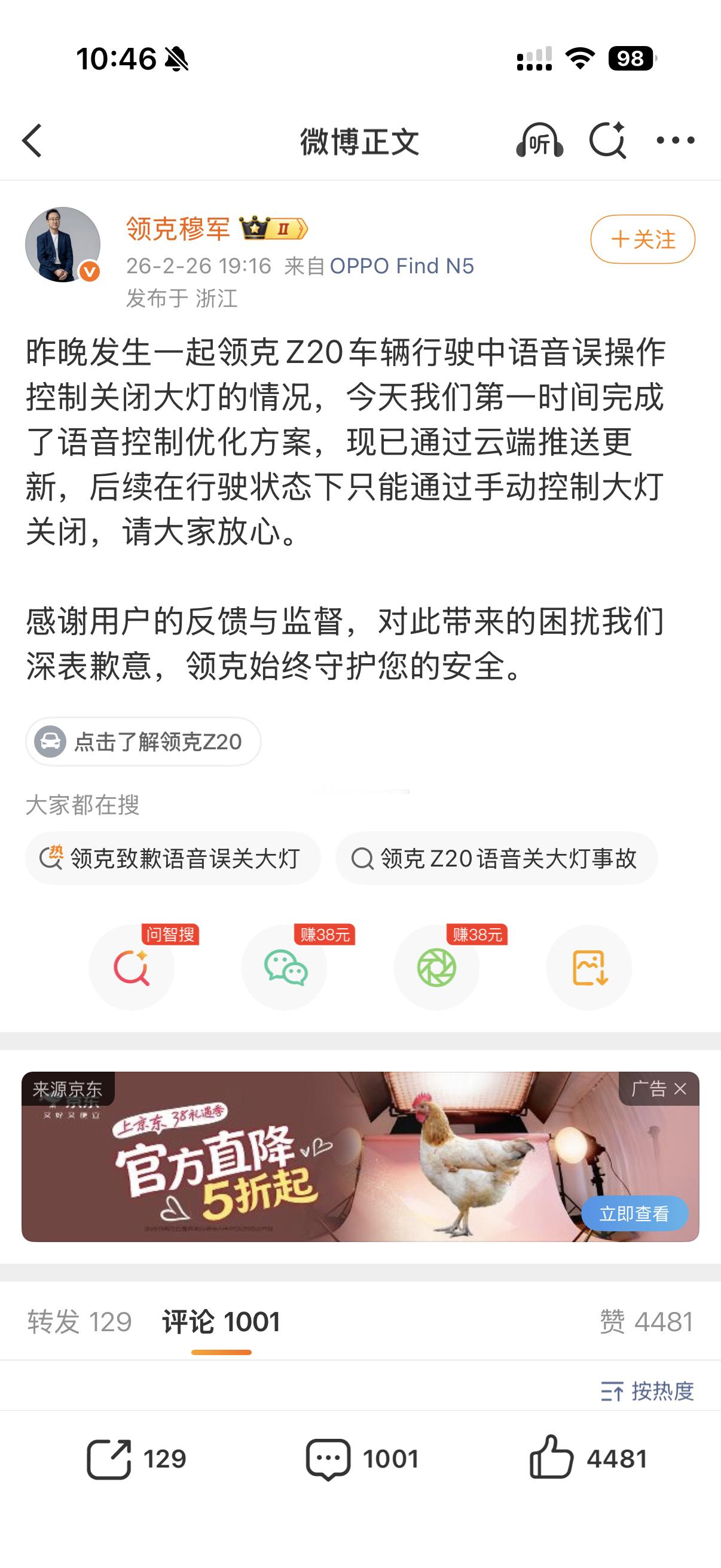 领克汽车销售副总经理穆军发博回应:第一时间完成语音控制优化方案,现已通过云端推送更新,行驶状态下大灯仅支持手动关闭。