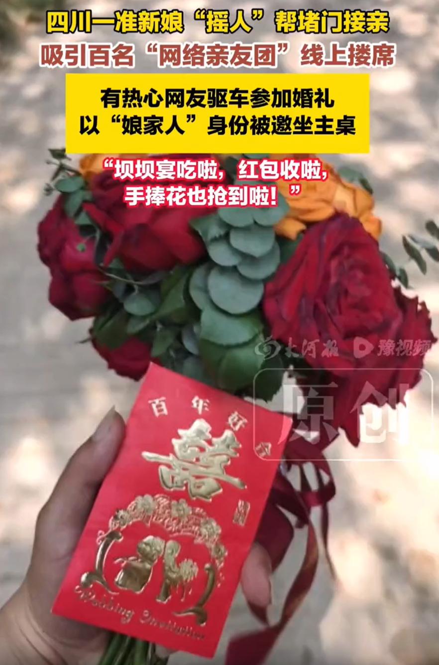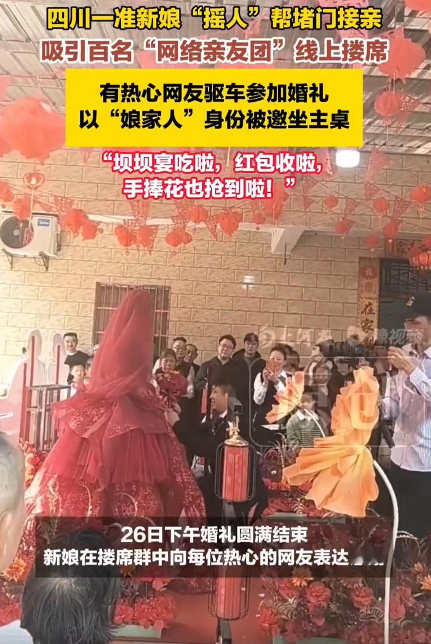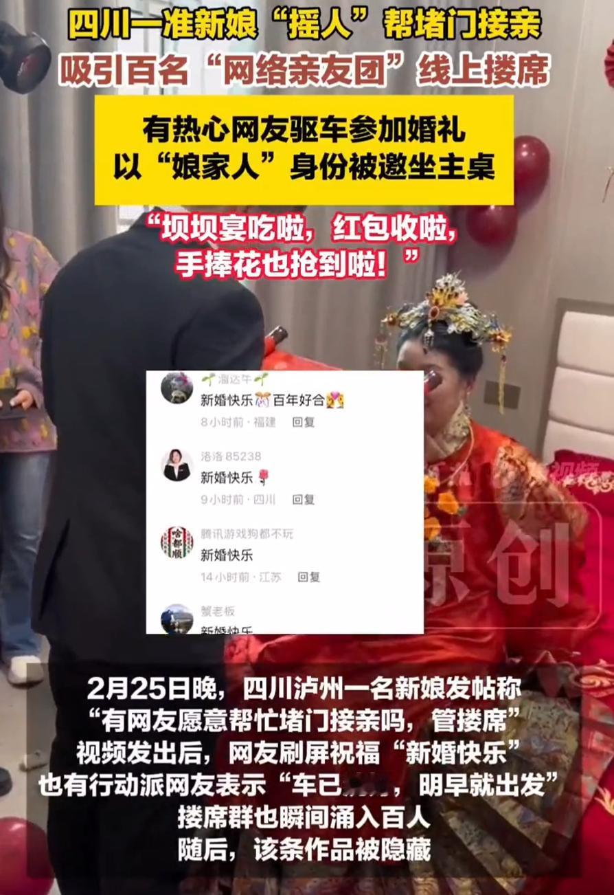 笑发财了!四川泸州,一对新人结婚,在结婚的前一天,新娘在网上发了个视频,找网友来帮忙堵门,本来就是随口的一个玩笑,结果被当真了,吓得新娘连夜隐藏了视频,但依旧没挡住网友们的热情,网友:这是不想把自己嫁出去啊 结婚前一天,新娘闲着没事干,随手发了个视频。视频内容也很简单,就问网友有没有人愿意来帮忙堵门接亲,管搂席 本来就是一句玩笑话,新娘估计也没当真,视频发出后,评论区全是祝福新婚快乐的,这倒正常。不正常的是,真有人表示车已经洗好了,明早就出。更离谱的是,还有人拉了个搂席群,瞬间涌进去上百号人 新娘吓得赶紧把视频隐藏了。但已经来不及了。第二天一大早,真有网友开车前来参加婚礼,而新娘也没含糊,真给了红包,还请人家吃了婚宴 其实这事想想也挺有意思的,一般来说,堵门的基本都是伴娘团,翻来覆去就那几个游戏,红包塞得差不多了就开门。接亲的也是一群熟人,流程走完就算完事。整个过程像是完成任务,热闹是热闹,但总觉得少了点什么 可这次不一样,新娘一句玩笑话,网友当真了。网友一当真,新娘也当真了。最后真有人去了,新娘也真接待了 这些网友跟新娘非亲非故,就因为在网上刷到一个视频,第二天就开车过去了。这种说走就走的行动力,这种对陌生人的信任,其实也很难得 婚礼这种事,本来就是越热闹越好。来的都是客,不管是亲戚朋友,还是网友路人,能来就是缘分。新娘请网友吃顿饭,网友给新娘送个祝福,这买卖不亏