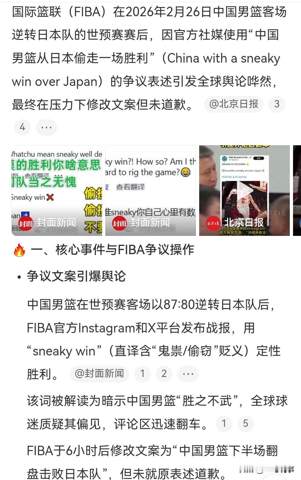 国际篮联真够下作的,很明显的就是针对中国,太恶劣了。 FIBA社媒称中国男篮偷走胜利。 国际篮联遭到了很多网友无情的嘲讽,然后不得不再次更正发文。 明明是裁判搞小动作,想让我们中国队输。 中国男篮那赢的是光明正大。 这个国际篮联的社媒竟然说中国队偷走胜利,国际篮联太无耻了。 奉劝国际篮联不要再睁眼说瞎话的针对中国了。