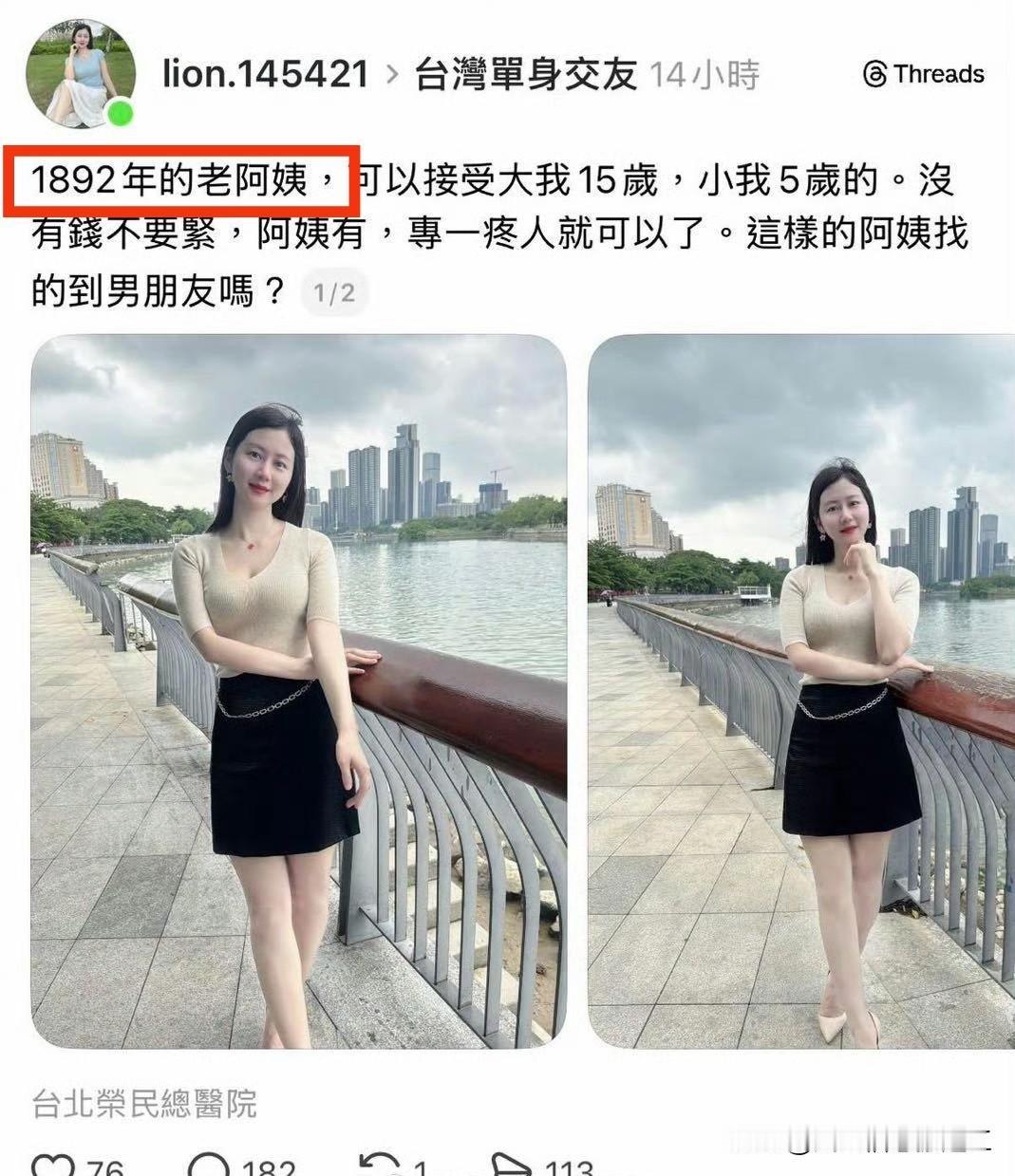 台湾省1892年老阿姨交友(这么算也是90后),可以接受大15岁,也可以接受小5岁,阿姨有钱会疼人[呲牙]