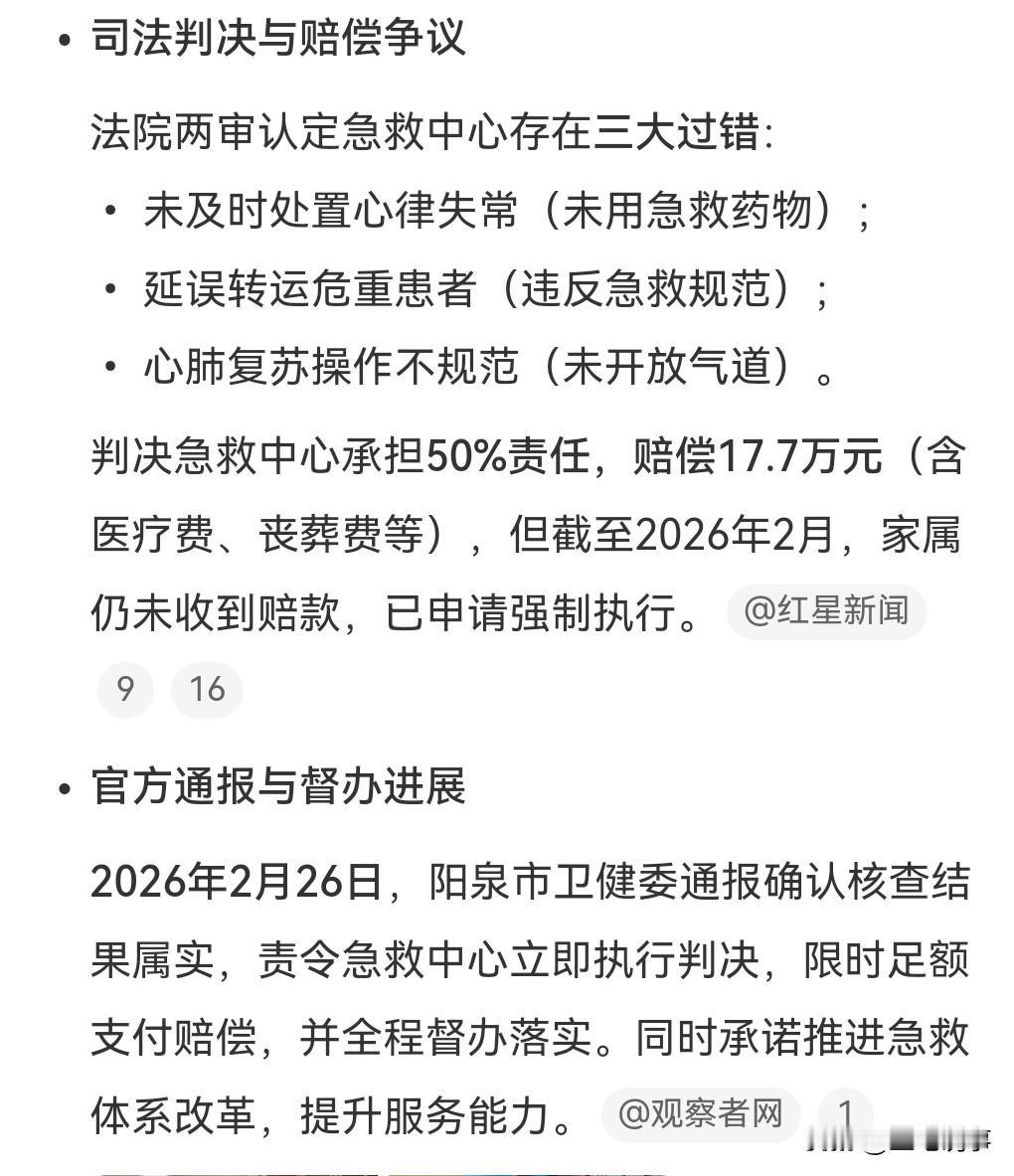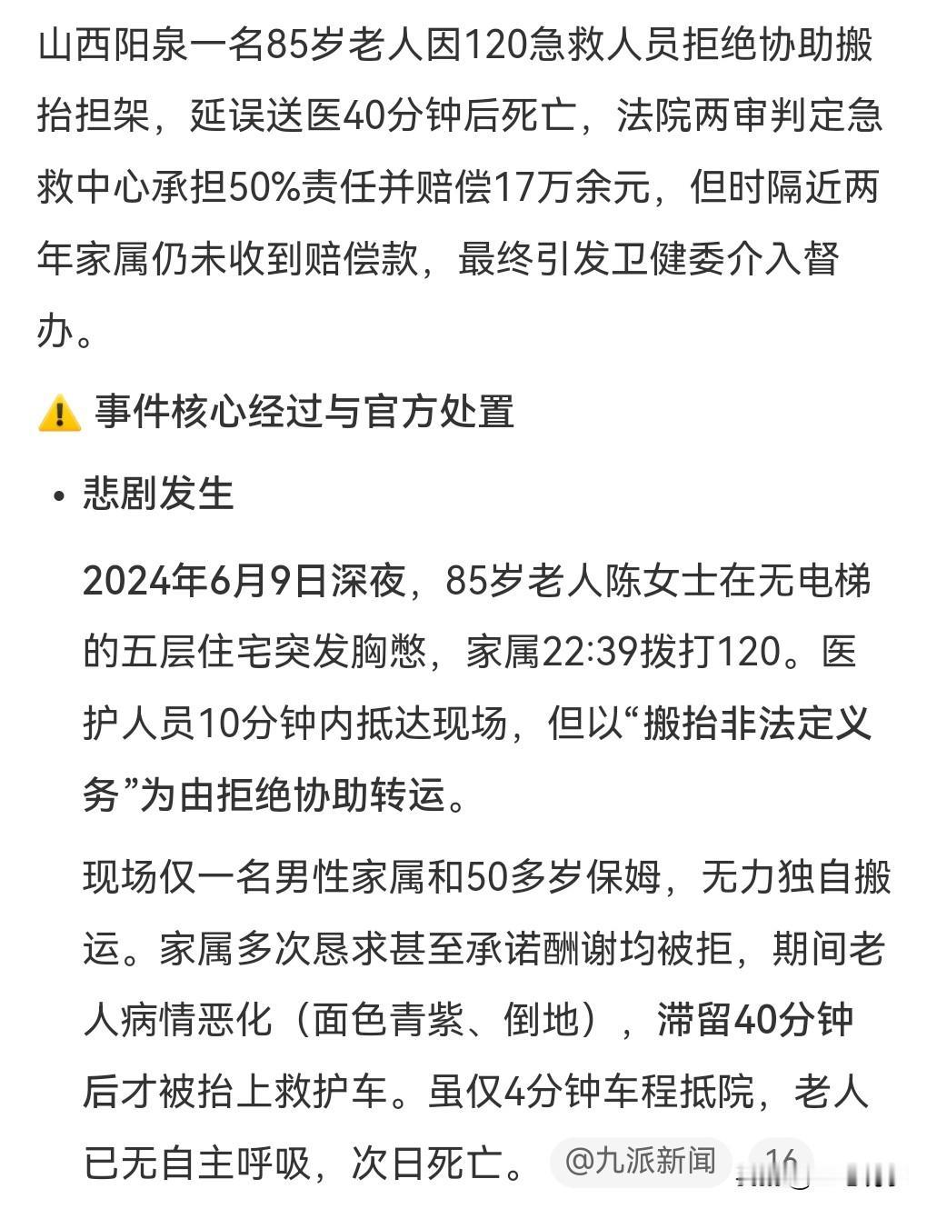 2024年一位80多岁的老人,因为急救人员拒绝帮忙搬抬老人,结果因为延误治疗导致老人死亡。 搬台老人不是急救人员应该做的吗?什么时候可以拒绝搬抬了? 人命关天,急救中心竟然出现这样的急救人员,相当的悲哀呀。 家属起诉急救中心,需要赔死者家属17万。 没想到判决后这急救中心一直不履行,这是想怎样是想当老赖不成吗? 近日这个事儿又上热搜了。 卫健委已经责令急救中心必须要赶快赔偿。 不知道有什么好拖的,尊重法院判决就行了,十几万对急救中心来说也不是很多。