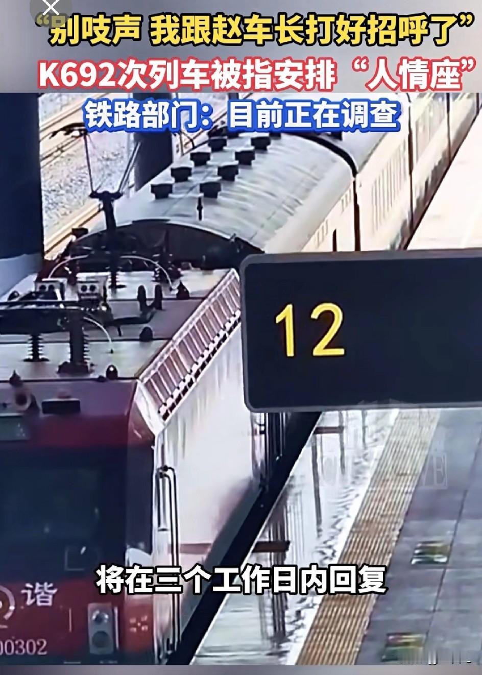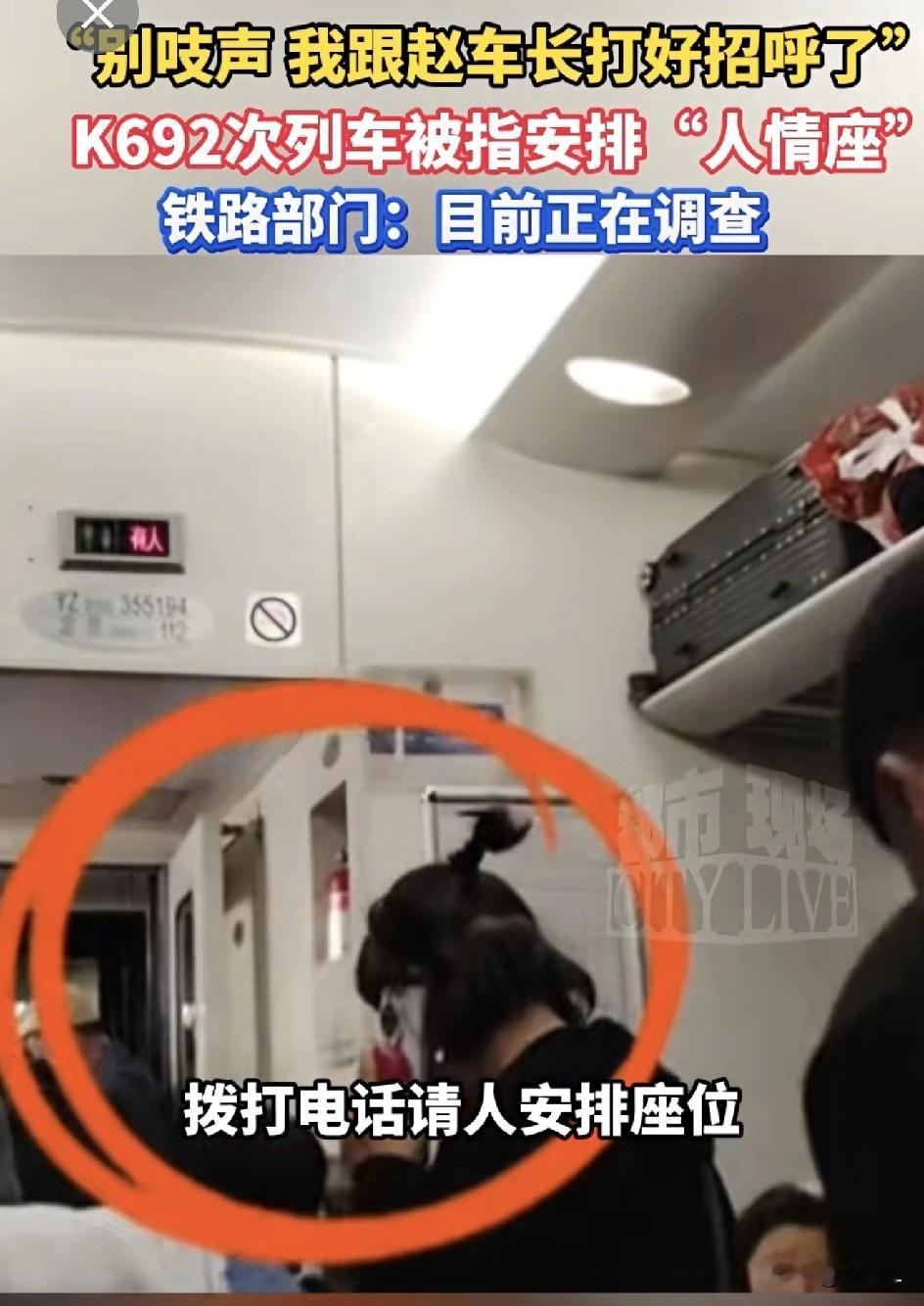 彻底吵翻!K692列车“人情座”引爆全网:有人骂特权,有人说车长太冤! 2月23日晚9点多,K692次列车在云南曲靖站上来3名无座旅客,其中一名女子在挤到爆的14号车厢直接打电话找人安排座位。 电话那头更是直接交代:你别吱声,我已经跟赵车长打好招呼了! 只是电话声音很大,即便在挤满人的嘈杂车厢,电话对面的声音依然清晰可闻。 说完,三人直接离开车厢,而当时普通乘客想补座,全都被答复:没位置! 视频一发出,直接火遍全网,播放量破600万,很多人第一时间骂走后门、搞特权,舆论直接炸锅。 记者联系12306,据说已经登记工单;包头客运段也表示,正在调查处理,三个工作日之内会有结果公布。 但随着事情发酵,全网观点直接两极分化,有网友说: “真没必要骂!车票都是12306和车站实名制售卖,一人一位,列车长根本动不了乘客的正规座位,也不可能占别人的位置。” “满员车次,车长能安排的,只有餐车空位、宿营车、乘务员专属休息位,这本来就在权限范围内,一没占座、二没损害任何旅客利益。” “乘务员自己的休息位,给亲戚朋友临时坐一下,多大点事?” 更有网友扎心调侃:“车长把你放心上,你把车长放网上,这波车长也太冤了!” 一边骂特权,一边心疼车长,这事你怎么看? 大家觉得,列车长在权限内帮熟人安排座位,算违规吗?评论区说说你的看法! 素材来源:都市现场,侵联删!