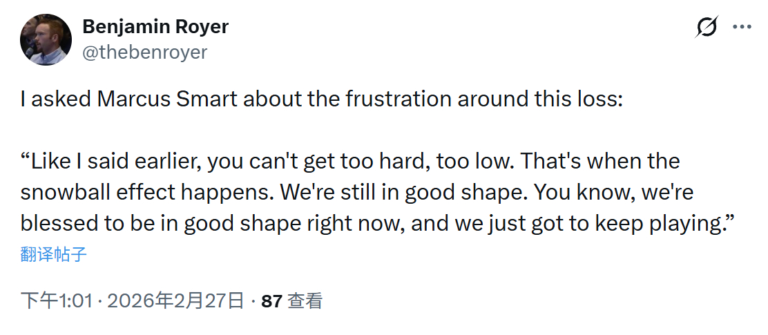 “就像我之前说的,你不能太沮丧,不能太垂头丧气,那样就会产生滚雪球效应。我们现在的情况还算不错。你知道,我们很幸运能保持这样的状态,我们只需要继续努力。”