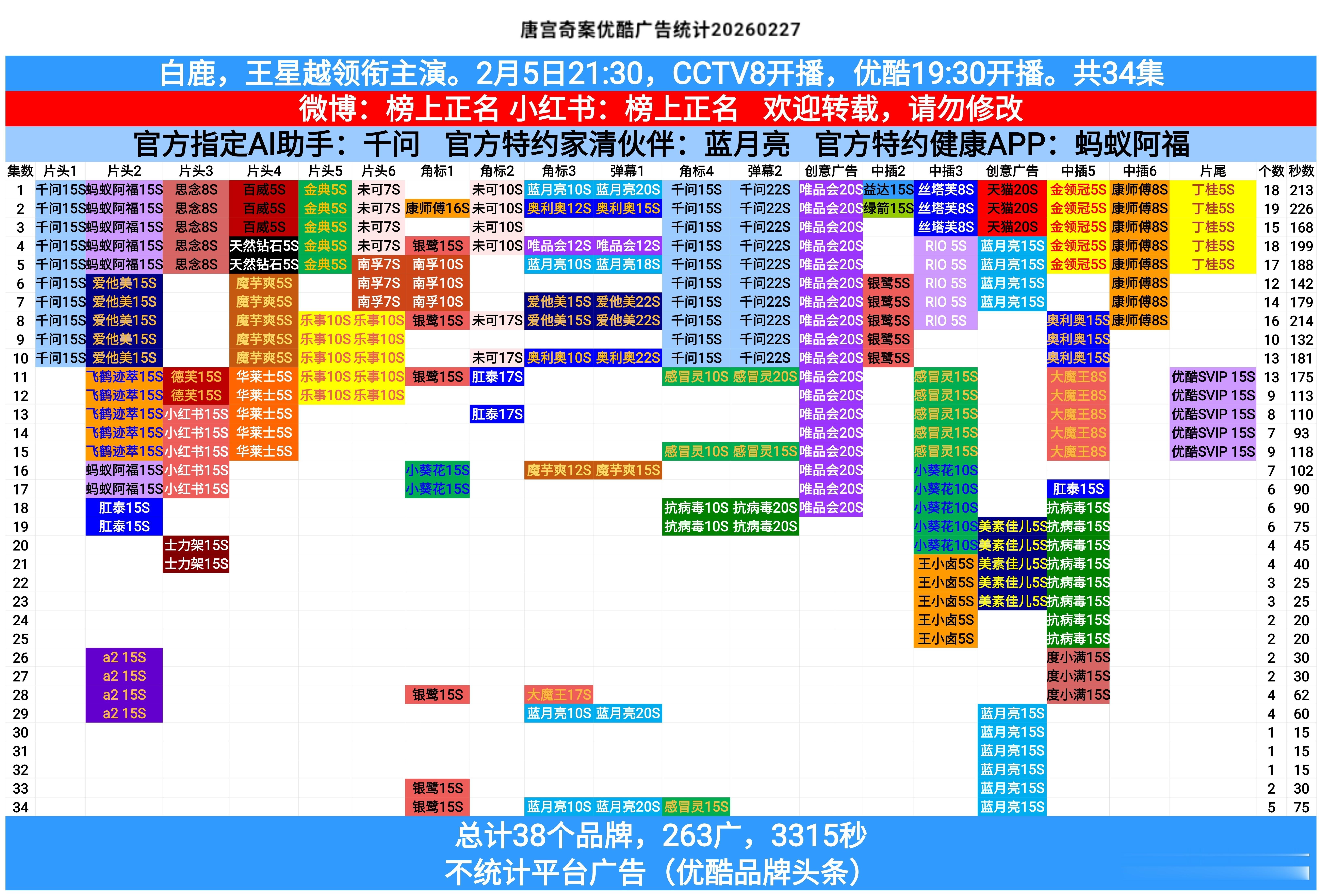 白鹿主演的唐宫奇案,超点后第五次加广!此次再加4广!广告总数263广!时长达3315秒!