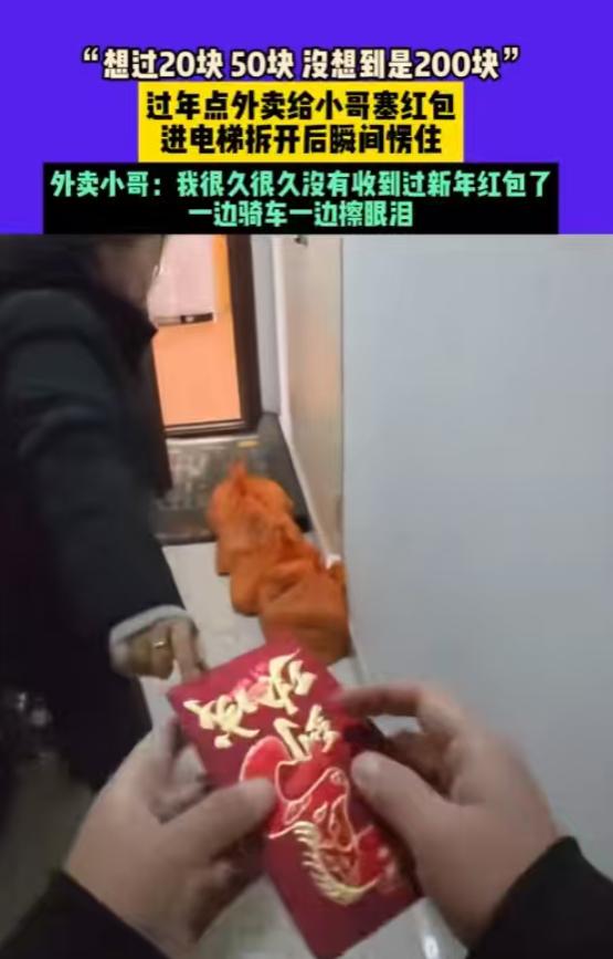 江苏,外卖小哥大年初一还在跑单,餐送到后顾客塞给他一个红包,小哥猜可能是20、50,走到楼下拆开一看,两张崭新的100块,他当场愣在原地,随后红了眼眶。 江苏有个外卖小哥,大年初一这天,没在家过年,照样骑着电动车,在街头巷尾穿梭跑单。 这一天,他像往常一样完成取餐、送餐的流程,直到傍晚,他接到一单送到小区高层的订单,取餐时老板特意多给了他一个包子,说 “大年初一,吃个包子图个吉利”,他心里一暖,小心翼翼地提着餐品,按时赶到顾客家门口,敲门、递餐、送上一句 “新年好,本以为这只是无数普通订单中的一单,可接下来发生的一幕,彻底打破了他的平静。 顾客没有立刻关门,而是从家里拿出一个红包,执意要递给他,小哥一开始连连推辞,他习惯了靠自己的劳动赚钱,不习惯接受陌生人额外的好意,可对方十分真诚,笑着说 “看你跑这么辛苦,大年初一也不能回家,这是一点心意,别嫌少”, 推脱不过,他最终收下了这份心意,指尖触到红包的瞬间,他能感觉到里面薄薄的两张纸,心里默默猜测,也许是二十块,也许是五十块,在他看来,不管多少,都是一份温暖,他已经足够感激。 走下楼的时候,晚风更凉了,他找了个避风的角落,轻轻拆开红包,整个人瞬间愣在原地,里面不是小额的零钱,而是两张崭新的一百元,整整两百块,这个数字,远远超出他所有的预料, 那一刻,他站在楼下,半天说不出话,情绪突然涌上心头,眼眶一下子就红了,他想起早上冻得僵硬的双手,想起爬六楼时的气喘吁吁,想起顾客冷漠的催促,也想起独居老人递来的热水、老板给的包子,所有的委屈和辛苦,在这一刻都化作了暖流。 他不是因为钱而激动,而是因为这份突如其来的善意,击中了他心底最柔软的地方,在外打拼的人,最渴望的从来不是惊天动地的帮助,而是被看见、被理解、被尊重,平时跑单,他见过太多匆忙的身影,听过不少催促的话语,承受过因超时带来的指责, 很多人习惯了快捷的配送服务,却很少有人在意,骑手背后有多辛苦,他们每天要跑几十甚至上百公里,在车流中穿梭,在楼梯间奔跑,饭顾不上吃,水顾不上喝,遇到雨雪天气,路面湿滑,还要担心摔倒,一个差评,可能影响一天的收入,一个投诉,可能让之前的努力大打折扣,他们是城市里最忙碌的群体之一,却也是最容易被忽视的群体。 他们靠双手劳动,靠汗水赚钱,不偷懒,不抱怨,不放弃,上要照顾老人,下要抚养孩子,再苦再累,都自己默默扛下来,还记得,有一次下雨天,他为了按时送餐,不小心摔倒在路边,餐品洒了一半,他不顾身上的泥泞,连忙给顾客道歉,又自己掏钱重新买了一份送过去, 那天他淋得浑身湿透,却没有一句怨言,他不是没有情绪,而是不敢轻易流露,不是不想脆弱,而是身后没有可以依靠的人,他知道,自己一旦倒下,家里就没了依靠。 正是这样一群默默支撑家庭、支撑城市的人,在春节这样的日子里,依然坚守在岗位上,他们放弃团圆,选择奔波,放弃休息,选择担当,用自己的辛苦,换别人的方便,用自己的坚守,换家人的安稳,他说,他多跑一单,就能多给孩子攒一点学费,多给父亲买一点好药,哪怕自己辛苦一点,也值得。 而这位顾客递出的两百元红包,看似只是一个小小的举动,却承载着最真诚的体谅,它不是施舍,不是怜悯,而是对劳动者最直接的敬意,是对坚守最温暖的回应,是陌生人之间最珍贵的善意,就像黑暗中的一束光,照亮了李磊奔波的路,也温暖了他疲惫的心。 这件事虽然很小,却照见了最真实的人间,我们总在谈论时代的发展、城市的进步,可真正让一个城市有温度的,从来不是高楼大厦,而是人与人之间的善意,不是多么宏大的口号, 而是藏在细节里的体谅,就像独居老人递出的热水,就像老板给的包子,就像顾客递来的红包,这些小小的善意,汇聚在一起,就是一座城市最温暖的底色。 千万个像他一样的外卖小哥,组成了社会最坚实的底色,他们在清晨出发,在深夜归来,在节日里坚守,在风雨中前行,他们不张扬,不抱怨,用自己的方式,扛起生活,扛起责任,他们是家庭的顶梁柱,是城市的摆渡人,是时代里最平凡也最伟大的奋斗者,他们用汗水浇灌希望,用坚守书写担当,在平凡的岗位上,书写着不平凡的人生。 而那一份突如其来的红包,温暖的不只是他一个人,更是无数在外漂泊、努力生活的人,它告诉每一个正在辛苦奔波的人,你的付出,有人看得见,你的辛苦,有人会心疼,生活从来都不容易,但正是这些不期而遇的温暖,让我们在疲惫时仍有勇气,愿每一个努力生活的人,都能被温柔以待。
