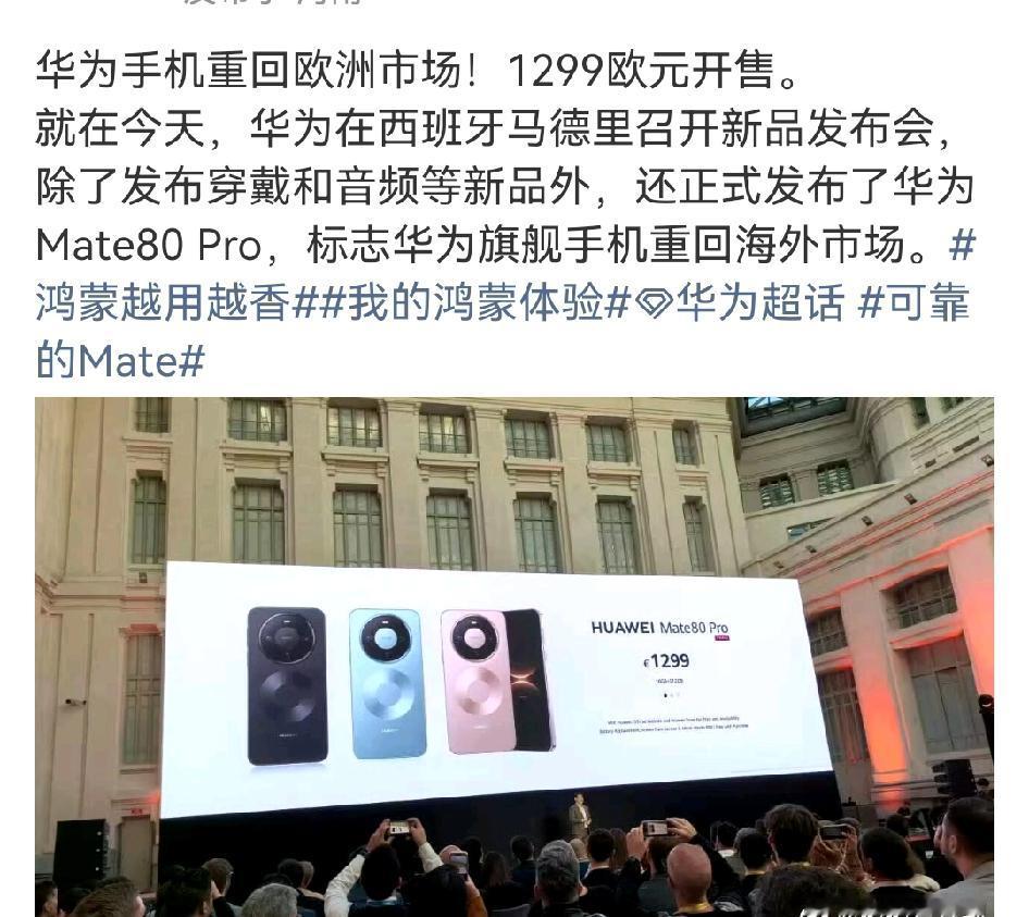 华为手机马德里发布会,1299欧元起售。 华为手机要重返国际市场了,要不是当初被恶意制裁,华为可能早就是国际手机市场的龙头了。 当初制裁后,很多人觉得华为手机不行了,然而华为仅仅用几年的时间又重新站起来了,真是太不容易。