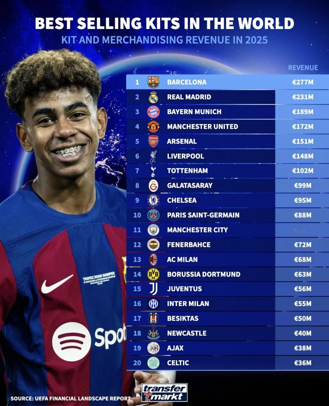 巴塞罗那以2.77亿居首;皇家马德里和拜仁慕尼黑以2.31亿和1.89亿排名二三。