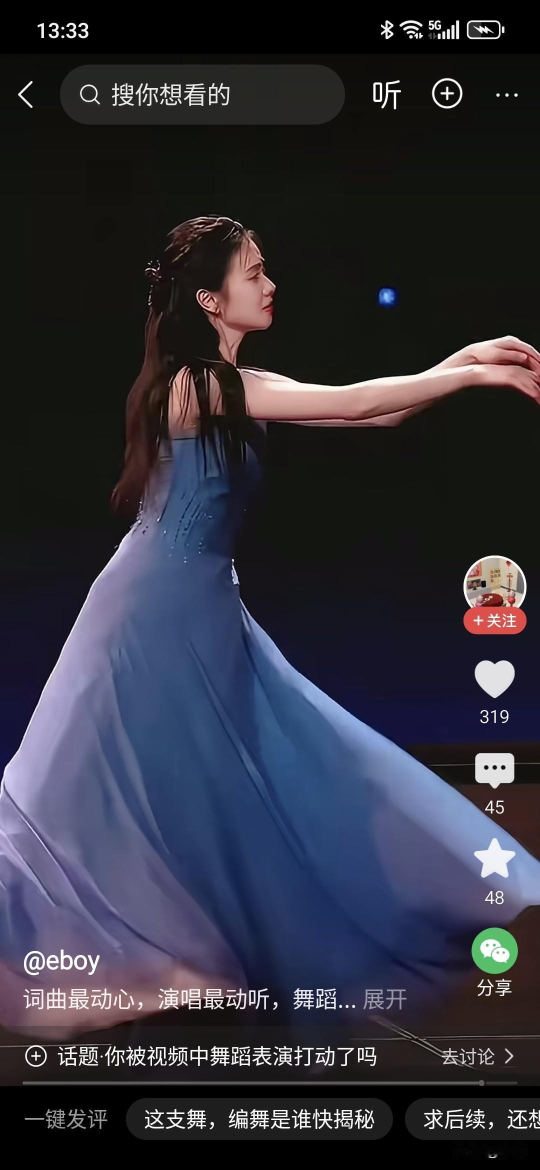 刘浩存,一夜间让舞蹈成为了直击灵魂深处的唯美篇章,也让她自己成为了全中国人的女神。 记忆中春晚舞台何曾有过这种能唤起沉睡在心底久远的人文情绪表演,海来阿木的演唱固然入心入骨,但刘浩存全身上下精确到每一个眼神、每一寸肢体的神级舞美才是这一次舞台表演的加分项。 如果说海的歌曲能循环播放十次,那刘的舞蹈就足以登上每个人的手机封面,两个人全心演绎的舞台镜头,就是在放到几十年后,在许多人的内心,仍然会击激荡起千万种魂魄涟漪!