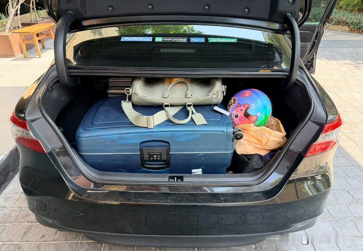 这次来出国旅游我租了台丰田凯美瑞 主要是因为他的后备箱空间真的大 我们三个箱子分别是32寸26寸和20寸, 再放下三个箱子后,还能放下我们的随身行李包。 这组尺寸搭配(32寸托运+26寸托运+20寸登机)是典型的家庭长途旅行配置,既满足了大量物资的托运需求,又保留了随身登机的灵活性,满足典型的家庭度假场景。