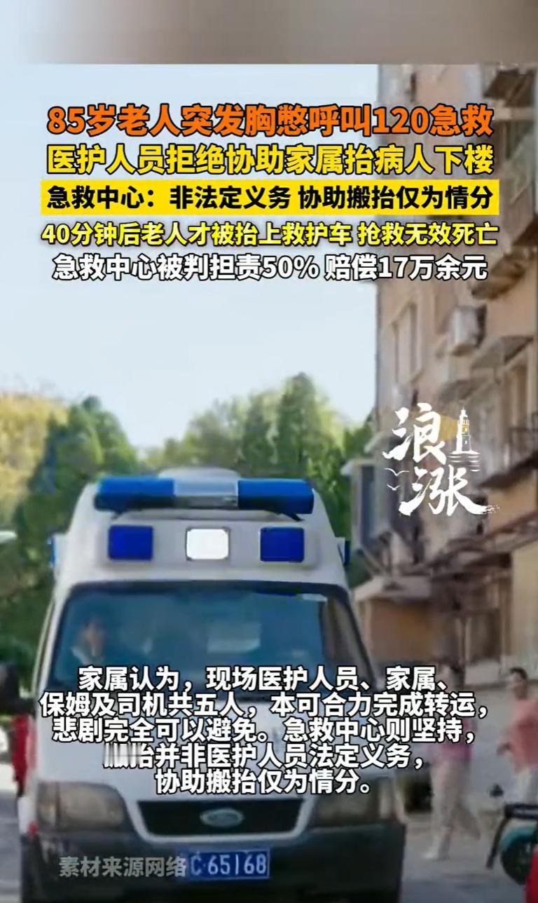 山西阳泉,85岁的奶奶突发胸憋,家住五楼,好巧不巧还是那种老式步梯。120赶到后,愣是杵在门口不动手,甩下一句“这不归我们管,搬抬是家属的事,最多算个情分”,就让家属自己想办法。奶奶强撑着病体,靠在床头挨个给亲友打求助视频,一遍遍拨打却没人接。就在这节骨眼上,老人病情急转直下,脸色青灰,直接躺倒在床上。急救人员这才慌了神,和家属俩人跌跌撞撞把人抬下楼,从车到楼下再到医院,整整耗了40分钟。到医院人已经没气了,抢救无效死亡。家属一纸诉状,将急救中心告上法院。法院判决急救中心担责50%,赔偿17万。然而,执行却成了难题。   冯女士的婆婆陈奶奶,已经85岁高龄了。   陈奶奶住在一栋老式的六层居民楼里,这种楼房没有电梯,进出全靠两条腿走楼梯,也就是常说的“步梯房”。   2024年6月9日,陈奶奶突然感觉胸口堵得慌,喘不上气,情况非常紧急。   家里人一下就慌了神,不敢耽搁,赶紧拨打了120急救电话。   电话打完,一家人心里稍微定了定神,想着只要救护车一到,把老人送到医院就没事了。   他们怎么也不会想到,更大的难题不在路上,而在家门口。   没多久,急救人员就到了,他们提着急救箱,跟着家属王先生爬上五楼,进门后立刻给陈奶奶做检查。   可当大家准备把老人往医院送时,问题来了。怎么下楼?   王先生看着来的急救人员,有医生,有护士,还有司机,心想这几个人搭把手,加上自己和保姆,五六个人,怎么着也能把老人平稳地抬下去。   他满眼期待地向急救人员求助,希望他们能帮忙一起把老人抬上担架,送下楼。   但急救人员很明确地表示,这不是他们的工作,搬抬病人不是他们的法定义务。   他们说,这是家属自己的责任,得自己想办法找人,或者实在不行,就打110求助警察。   王先生当时懵了,一边是躺在床上等着救命的85岁老母亲,一边是拒绝施以援手的急救人员,时间一分一秒地在流逝。   没辙,只能自己想办法。   陈奶奶强撑着虚弱的身体,拿起手机开始给亲友打电话求助。   家里人这边也没闲着,赶紧拨打110,希望警察能来帮忙。   亲友的电话迟迟没有接通,110那边也还在等待回应。   就在这个空当里,陈奶奶的情况急转直下,她本来还能强撑着,突然间就躺倒在床上,眼睛紧闭,脸色肉眼可见地变得青紫起来。   看到这一幕,所有人都吓坏了,那名男医护人员也意识到不能再等了,这才和王先生两个人,合力把陈奶奶抬上担架,跌跌撞撞地往楼下走。   从急救人员踏进家门,到老人最终被抬上救护车,中间整整过去了40分钟。   可惜,赶到医院后,一切都太晚了。老人被抬下车时,已经没有了自主呼吸。   医院全力抢救,但最终还是无力回天。   冯女士一家悲痛欲绝,同时也充满了愤怒和不甘,他们怎么也想不通,叫了救护车,急救人员明明在现场,为什么就是不肯搭把手?如果一开始大家就合力把老人抬下去,这40分钟也许就能抢回来,悲剧就不会发生。   越想越气,冯女士一家决定讨个说法,他们一纸诉状,把急救中心告上了法庭。   家属这边认为,救死扶伤是急救的天职,急救人员袖手旁观,眼睁睁看着家属自己想办法,错失了宝贵的抢救时机,负有不可推卸的责任。   而急救中心则有不同说法,根据相关规定和工作职责,院前急救人员的核心任务是“急救”,搬抬病人,特别是从楼上往下搬,这并不在他们的法定职责范围内。   他们甚至表示,协助搬抬,充其量只是一种情分,不是本分,不帮忙,不违法。   法院会如何判决呢?   《民法典》第五百零九条规定,当事人应当按照约定全面履行自己的义务。当事人应当遵循诚信原则,根据合同的性质、目的和交易习惯履行通知、协助、保密等义务。   法院指出,家属拨打120,双方即成立急救医疗服务合同,合同根本目的是将患者安全、及时转运至医院。搬抬是转运不可或缺的环节,若只到现场而不协助下楼,合同履行即有重大瑕疵。   且急救人员具备专业知识,知晓病情,在现场有五人、具备搬抬条件的情况下,依据诚实信用原则,协助搬抬起源于合同的附随义务。急救中心以非义务为由拒绝,属于因不作为而违反合同义务,构成了《民法典》第一千一百六十五条规定的过错。   法院认为,陈奶奶滞留家中40分钟,极大增加了病情恶化、错失抢救时机的可能性,应认定延误与死亡存在法律上的因果关系。   基于此,法院酌定急救中心承担50%赔偿责任,赔偿17万余元。   判决生效后,冯女士一家并没有等来那笔赔偿款,他们左等右等,急救中心那边始终没有动静。   无奈之下,冯女士一家打算向法院申请强制执行,走到强制执行的这一步,说起来真的挺讽刺的。   庆幸的是,卫健委已经约谈了急救中心,责令他们必须立即执行法院判决,足额支付赔偿款。   这意味着,冯女士一家的赔偿款很快可以到位了。   对此,您怎么看?