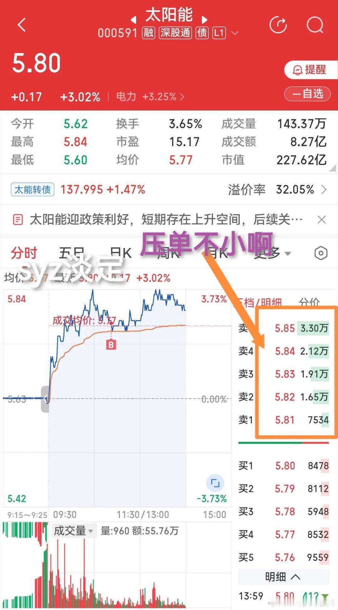 今天买了一点太阳能,看了一会盘面,感觉压力重重,看来还要再等几天才能选择方向。这里那么大压单,却又不跌,是什么意思呢?日线看,是一个三角形整理形态,就是拿不准要整理多长时间,先进一点,好有个念想,如果有那么一天,能够有表现,到时再决定是加是减,是去是留。特别提醒:贴图欣赏,并非推荐,据此操作,风险自担。✦✦✦本人仅此一号,不主动加人,主动加人者是骗子。请提高警惕,否则损失自负。✦✦✦