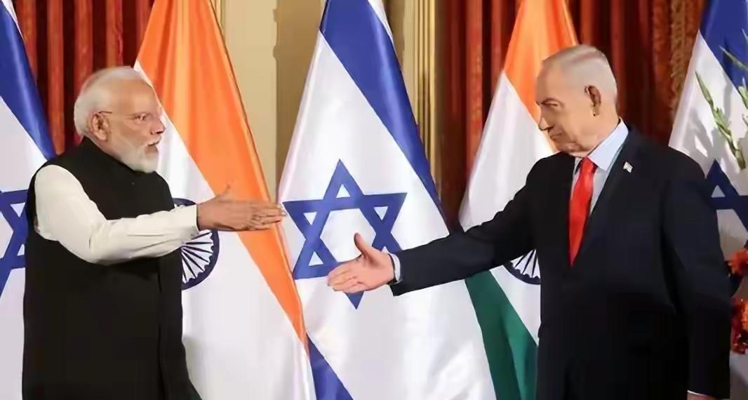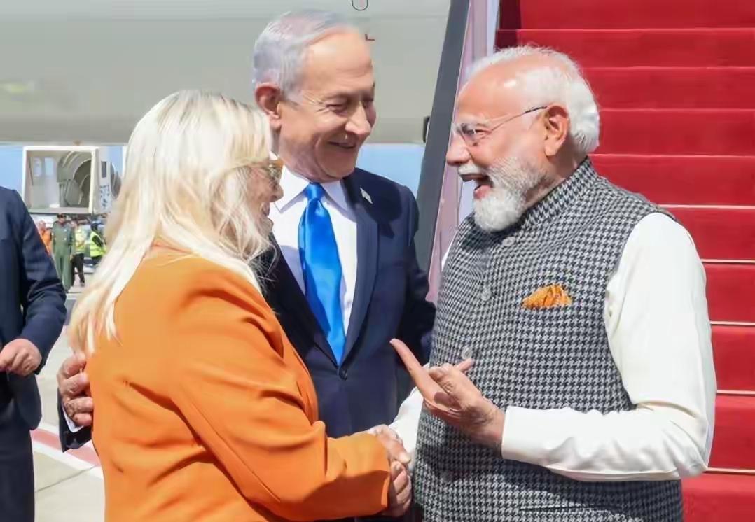 印度总理莫迪今天发文说:“抵达以色列。我非常荣幸能在机场受到内塔尼亚胡总理和夫人