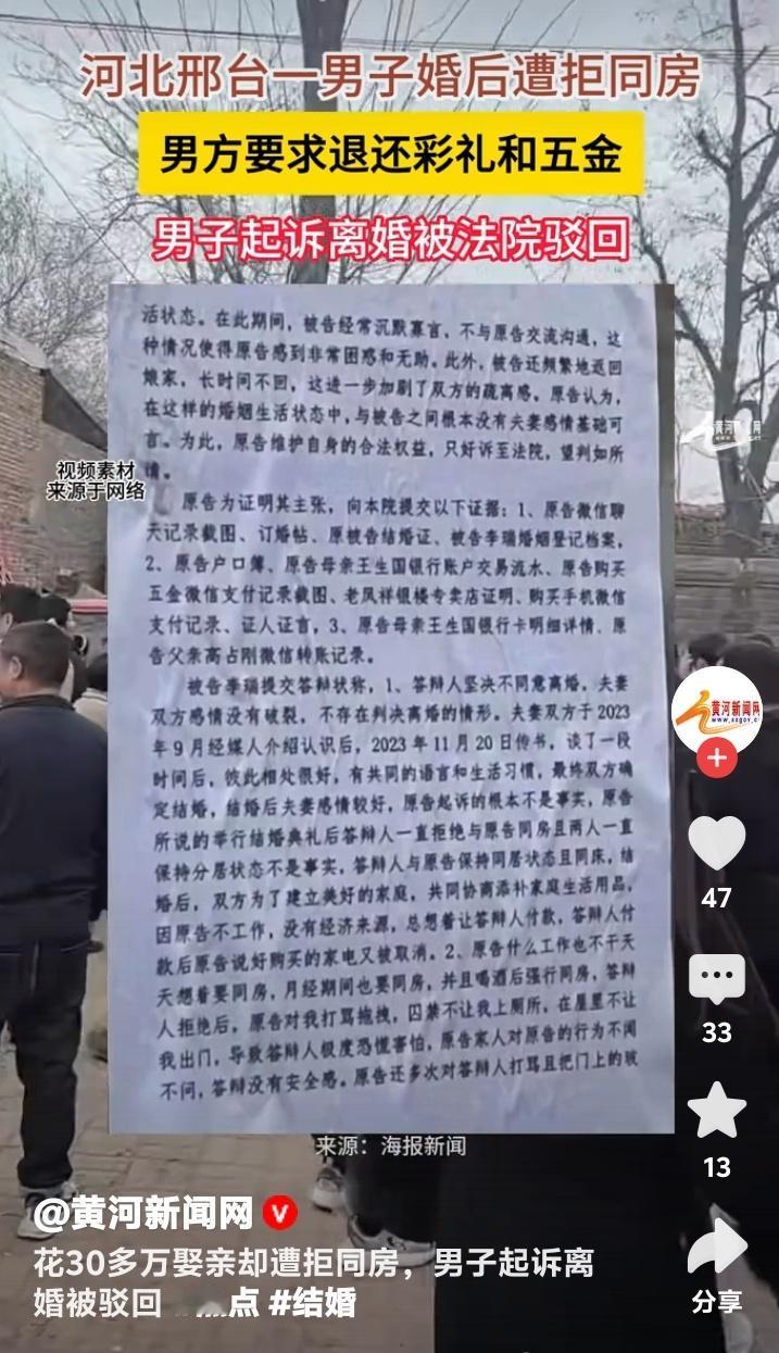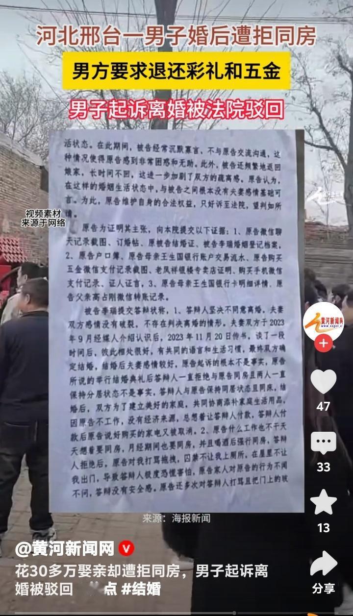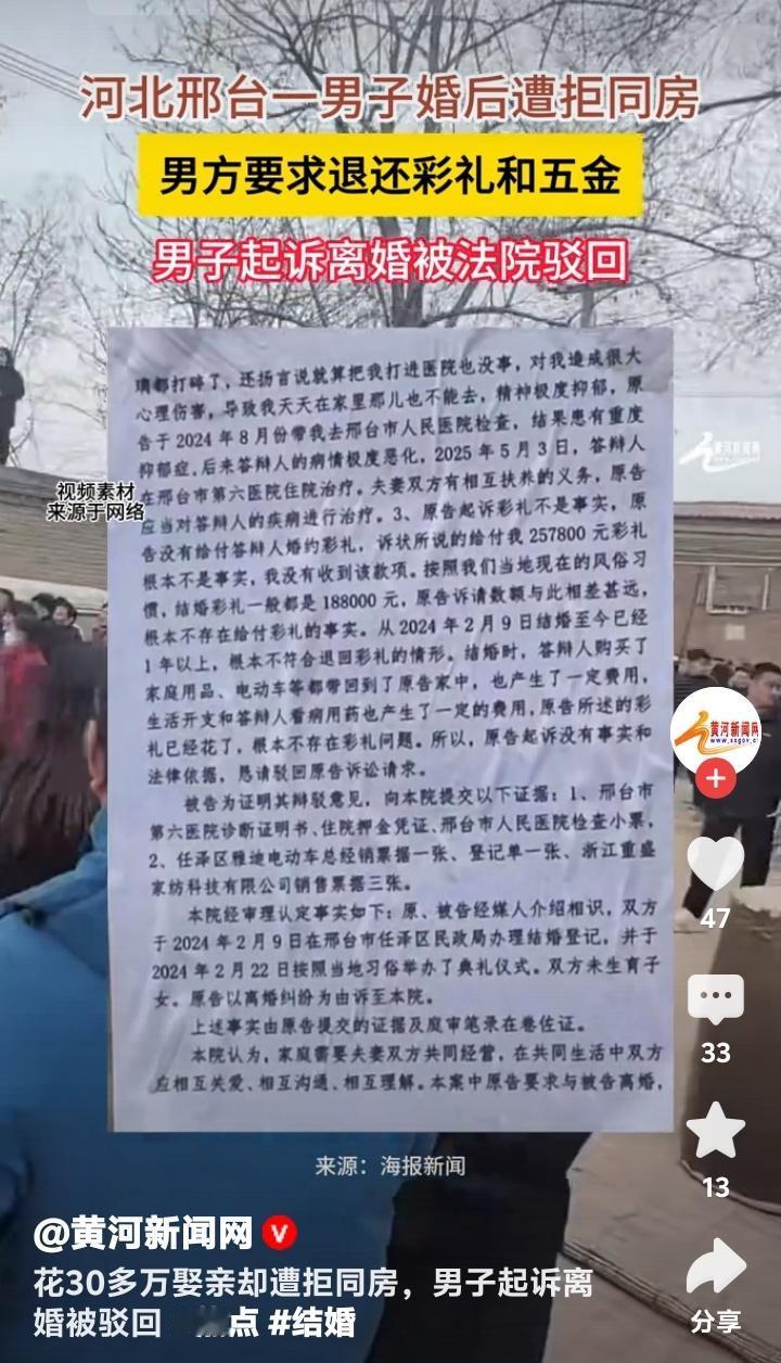 河北邢台30万彩礼娶妻十个月不让碰,法院竟判不准离!这究竟是婚姻围城还是彩礼陷阱? 当三十万血汗钱换来的是一纸冰冷婚书和十个月形同陌路的“夫妻”生活,河北邢台的高先生恐怕怎么也想不通,自己的婚姻为何会走到这般田地。更让他绝望的是,当他鼓起勇气向法院求助,要求结束这场名存实亡的婚姻并拿回彩礼时,得到的竟是一纸“驳回”判决。这背后,究竟是谁在纵容这场荒唐? 结婚典礼的喜庆锣鼓声仿佛还在耳边,但洞房花烛夜却成了漫长煎熬的开始。据男方所述,自2024年2月婚礼后,妻子李某便拒绝同房,长期分居,频繁返回娘家,十个月来双方无任何实质夫妻生活。这场用全家积蓄堆砌的婚姻,从一开始就笼罩在巨大的阴影之下。三十万,对许多普通家庭而言,是父母半生的积蓄,是未来生活的希望,如今却可能打了水漂。 面对如此境况,高先生选择诉诸法律。他提交了微信聊天记录、银行流水、购买凭证等证据,清晰地勾勒出这段婚姻的异常轨迹。然而,女方的答辩却将剧情引向了另一个方向。她否认拒绝同房,反指控男方无业、酗酒,甚至在其经期强行同房并实施家暴,导致其患上重度抑郁症。一场离婚诉讼,瞬间演变成罗生门。 法院的判决成了舆论哗然的焦点。任泽区人民法院认为,男方未能充分证明夫妻感情确已破裂,不符合法定离婚条件,因此驳回离婚请求。至于返还彩礼的诉求,因离婚请求未获支持,自然也成了无本之木。判决书中的“家庭需要夫妻双方共同经营,应相互关爱理解”等说辞,在残酷的现实面前显得苍白无力。 这判决合理吗?从纯粹的法条角度看,法官或许在严格适用“感情破裂”的认定标准。但法律不应是冰冷的条文堆砌,它应洞察人性,回应最朴素的正义观。十个月拒绝亲密接触、长期分居,这难道不是感情破裂最直接的证明吗?当婚姻只剩下法律外壳,强行维系是对双方的折磨,更是对婚姻神圣性的亵渎。 女方的“重度抑郁”诊断成为其重要盾牌。我们同情任何受心理疾病困扰的人,但诊断证明不能成为模糊是非的工具。其家暴指控缺乏报警记录、伤痕鉴定等关键证据支撑,而男方的“无夫妻之实”却有持续的生活状态佐证。天平的两端,证据的份量似乎并不平衡。这不禁让人深思,在类似的纠纷中,如何更有效地查明事实,避免让一纸诊断成为难以逾越的屏障。 这场官司暴露出的,远不止一桩婚姻纠纷。它尖锐地指向了“高额彩礼”这一社会顽疾。当婚姻被明码标价,感情便容易异化为一场高风险投资。一旦“投资失败”,男方往往人财两空,司法救济却道路坎坷。本案中,即便共同生活时间短、彩礼数额巨大,但因离婚诉求未成,彩礼问题便被搁置。这种处理方式,是否在无形中降低了“骗婚”的道德与法律成本? 男方的家属租用礼炮车到女方家维权,虽方式欠妥,却是走投无路下的悲鸣。当地介入调解是必要的,但根本的解决之道,在于司法能更接地气地审视此类纠纷的本质。婚姻应以感情为基础,当感情基础荡然无存,法律应勇于承认并解除其束缚,同时,对涉及大额经济往来的彩礼问题,也应建立更公平、及时的处置机制,不让老实人吃亏,不令投机者得利。 (来源:综合黄河新闻网、海报新闻、法院判决书及网络公开报道) 天价彩礼 婚姻困局