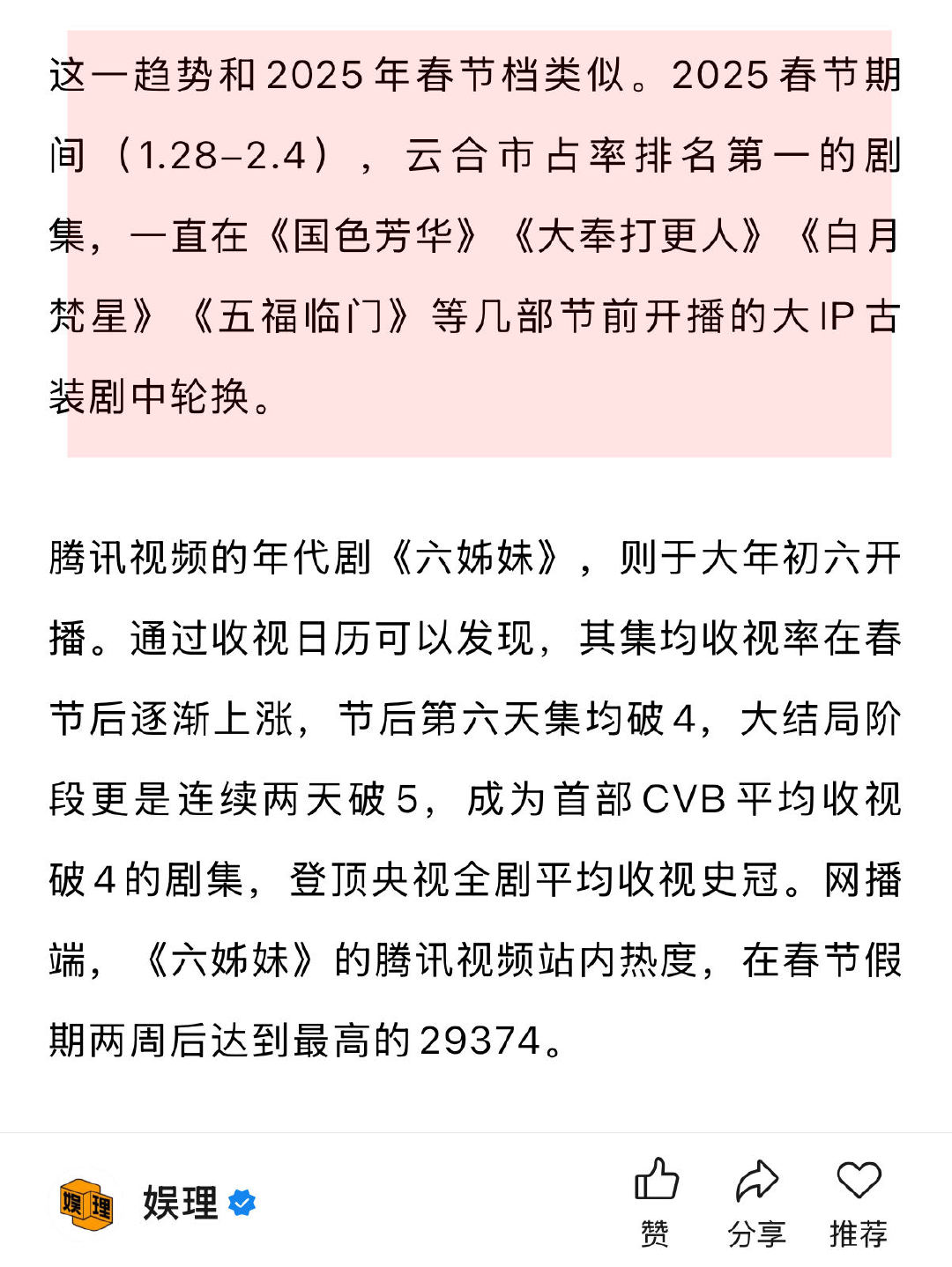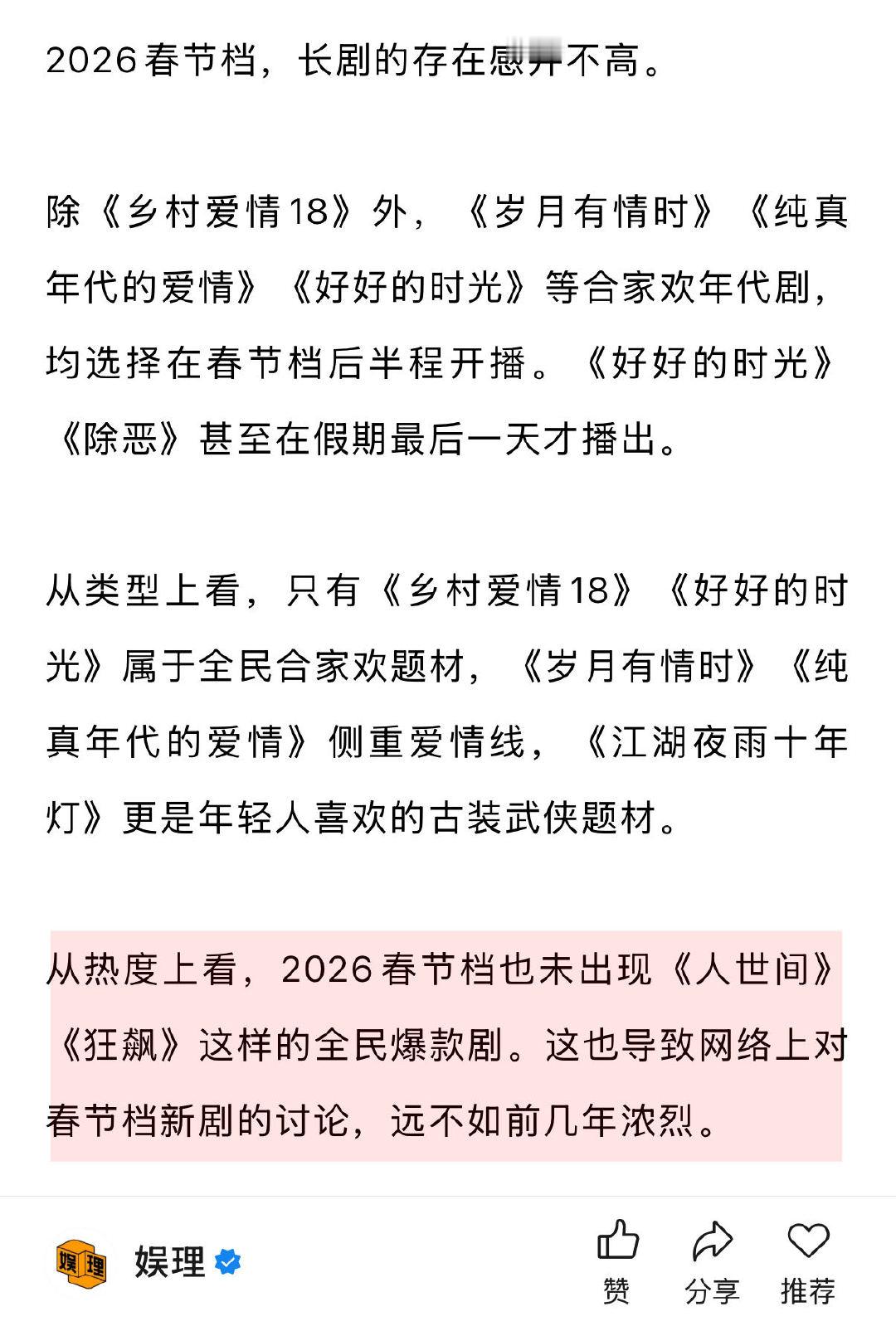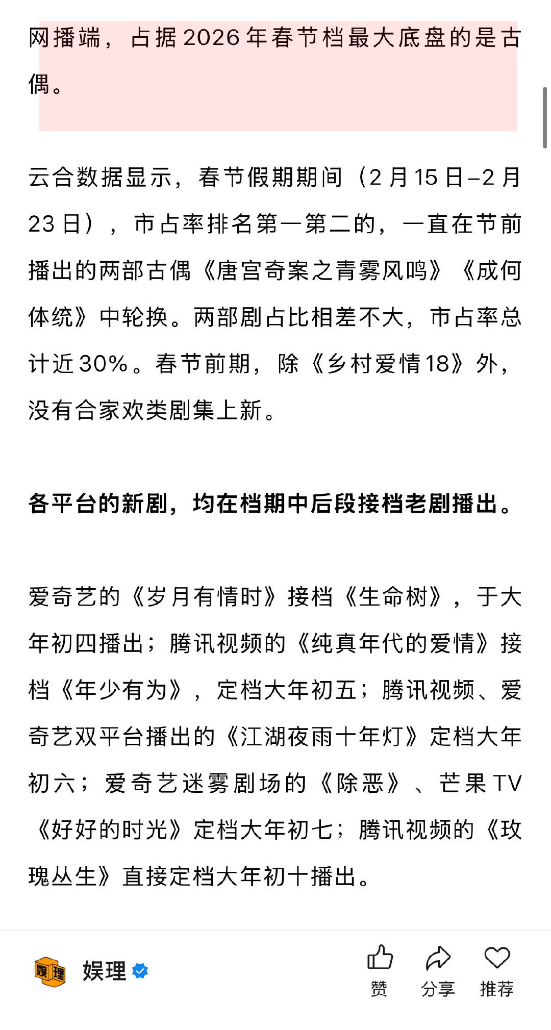 业内谈春节档为何难再出爆款剧 长剧为什么不卷春节档 长剧不会把大预算营销砸向“春节档”。某剧宣称春节期间演员很难配合线下宣传,大部分会转为线上,年前或年后再集中做线下合体活动。“春节期间电影院都被电影抢占了…长剧都在勒紧腰带过日子,宣发费能达到600万到1000万的屈指可数,很看重ROI,付不起那么高的费用。”娱理独家↓
