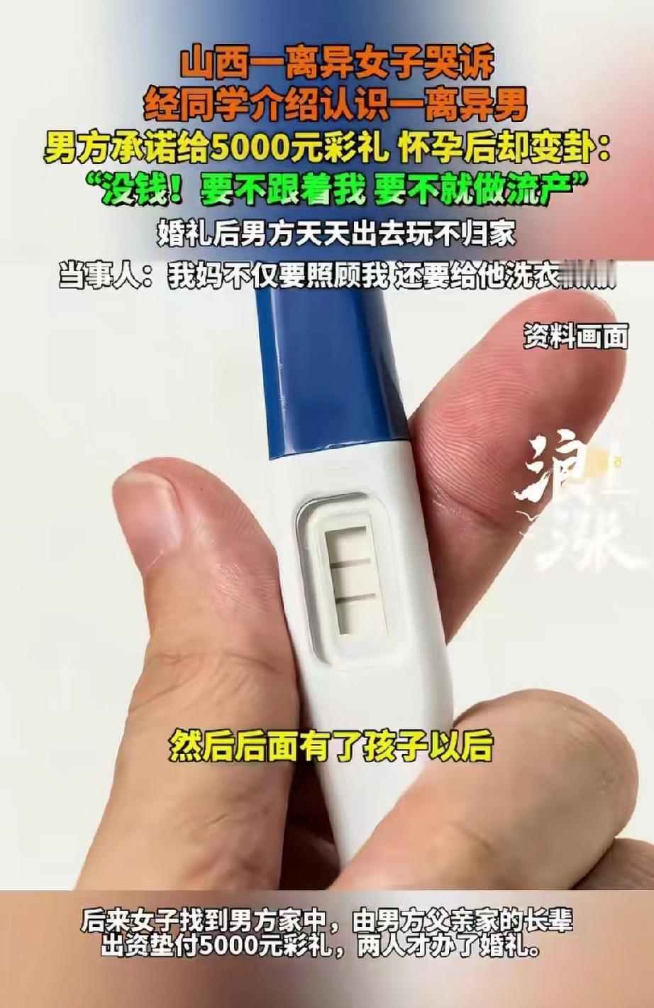妥妥的白嫖!山西,离异女子经同学介绍认识了同样离异的男子,谈婚论嫁时,女子想要5000元彩礼,男子满口答应,还趁机提出同居。万万没想到,同居怀孕后,男子一口咬定没钱,说好的彩礼钱没了,养孩子的费用也不愿意出,还要求女子要么流产,要么没名分的跟着他。女子觉得孩子是无辜的,只能让其母亲来帮忙,既要照顾大肚子的她,还要给没名分的丈夫洗衣做饭,说多了都是眼泪。 李女士之前有过一段失败的婚姻,离婚后一直想找个踏实靠谱的人,安安稳稳过下半辈子。 经同学介绍,她认识了同样离异的男子,两人一开始聊得还不错,相处一段时间后,感情慢慢稳定,很快就到了谈婚论嫁的地步。 李女士经历过一次婚姻,对物质没什么太高要求,也不图大富大贵,只象征性的跟对方提出要5000块钱彩礼,就当是个心意和保障。 男子当场满口答应,说得十分诚恳,转头就趁机提出想婚前同居。 李女士心里其实很犹豫,她清楚自己是易孕体质,一旦同居,很容易怀上孩子,加上两人都有过失败的婚姻,她更怕再一次看错人、走错路。 可男子不停哄她,一遍遍地保证:你放心,真要是怀孕了,我肯定负责到底,绝对不会让你和孩子受委屈。 听着这些甜言蜜语,李女士心软了,她真心以为对方是想好好过日子,便答应了同居。 可她怎么也没想到,自己这一让步,竟把自己推入了困境。 果然没多久,李女士就查出怀孕了。得知消息的那一刻,她还满心期待,可男子的态度却瞬间来了个一百八十度大转弯。 之前答应得好好的5000元彩礼,他直接翻脸说自己一分钱没有,连养活自己都困难,更别提养孩子。 他甚至狠心地给李女士两个选择:要么没名没分跟着他,什么都别计较;要么就直接去把孩子流掉,当这事没发生过。 李女士这才明白自己从头到尾都被算计了。可肚子里的小生命是无辜的,她实在不忍心打掉,只能硬着头皮跑到男方家里,找他父母讨个说法。 男方父母看木已成舟,孩子都有了,也不好再推脱,只好拿出钱垫付了那5000元彩礼,简单给两人办了婚礼。 李女士对此还抱有一丝希望,觉得成了真正的一家人,男子总该收心,担起丈夫和准爸爸的责任。 可现实却让她彻底失望。 婚后,男子不仅没有半点改变,反而变本加厉,天天出去吃喝玩乐,经常夜不归宿,把怀着孕的李女士一个人丢在家里,别说照顾她、关心她,就连人影都难得一见。 李女士挺着大肚子,行动不便,情绪也很低落。她母亲心疼女儿,特意赶来照顾她。 可让人寒心的是,老人不仅要细心照顾怀孕的李女士,还要给那个不负责任的女婿洗衣、做饭、打理家务,就算这样,还时不时被女婿甩脸色、冷对待。 看着母亲一把年纪还跟着自己受委屈,看着自己怀着孕却无人疼、无人管,再想想男子婚前婚后的巨大反差,李女士每天都活在后悔和眼泪里。 她只是想要一个简单安稳的家,只提了5000块钱的要求,却落得这样进退两难的下场。 不少人的遭遇都十分同情,也忍不住感叹:连5000块都要靠怀孕去赌的人,从一开始就不值得托付。 可事已至此,李女士只能带着未出世的孩子,在这段冰冷的关系里,默默承受着本不该她承受的苦。 其实,李女士完全可以拿起法律武器来,维权。 《民法典》第一千零七十一条规定:非婚生子女享有与婚生子女同等的权利,任何组织或者个人不得加以危害和歧视。 不直接抚养非婚生子女的生父或者生母,应当负担未成年子女或者不能独立生活的成年子女的抚养费。 本案中,李女士与男方虽未办理结婚登记、仅按习俗举办婚礼,二人所生子女属于非婚生子女,其法律地位与婚生子女完全平等。 男方不得以“没名分”“没结婚证”为由拒绝承担抚养责任,更不能以此剥夺孩子的生存与被抚养权利。 只要孩子出生且由李女士直接抚养,男方作为生父必须按月支付抚养费,涵盖生活费、教育费、医疗费等,直至孩子年满18周岁或能独立生活为止。 实践中,抚养费标准一般按男方月总收入的20%—30%确定;如果男方拒不支付的,李女士可持出生证明、同居证据、亲子鉴定等向法院起诉,胜诉后可申请强制执行,包括冻结账户、划扣收入等。 此外,男方以胁迫方式干涉李女士生育权、孕期拒不照料且让岳母承担家务等行为,虽违背道德与公序良俗,但法定抚养义务是强制性法律责任,李女士完全可以通过诉讼彻底维护自身与孩子的合法权益。