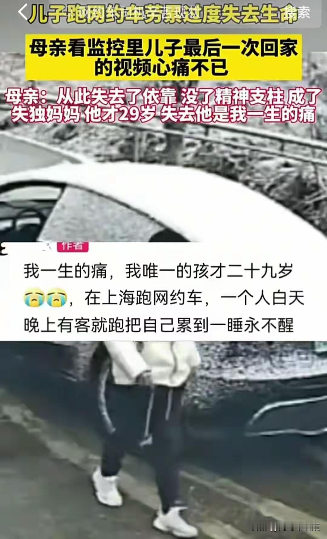 上海29岁网约车司机凌晨猝死方向盘上,母亲哭诉视频全网泪崩:他只想活着,算法却吃掉了他的命! (来源:综合自舜网、网易新闻、网友评论等公开报道) 那个清晨六点出门时还笑着说“妈,我再去跑几单”的儿子,再也没能回来。当上海29岁网约车司机小张被路人发现时,他趴在方向盘上,身体早已冰凉,手机屏幕却还亮着,刺眼地显示着“等待接单”。医院诊断:长期过度劳累引发的急性心梗。他的人生,被永远定格在了为下一单奔波的路上。 母亲的世界在那一刻彻底崩塌。她翻看着儿子最后回家的监控,画面里那个疲惫到几乎挪不动步的身影,成了锥心的永恒。她对着镜头哭到撕心裂肺:“我的依靠没了……他才29岁,他只是想好好活着啊!”这句绝望的呐喊,瞬间击穿了无数屏幕前同样在咬牙硬扛的普通人。 我们总被教育“勤劳致富”,可为什么有人勤劳至死,却依然换不来一份安稳?网约车司机,这份看似自由光鲜的职业,内里早已被冰冷的算法和规则捆绑成一座无形的牢笼。他们不敢下线,怕服务分降低;不敢休息,怕错过高峰奖励;甚至不敢多喝一口水,怕找不到厕所耽误接单。自由,成了最昂贵的奢侈品。 日均在线14小时以上,三餐不定,以车为家。这不是励志故事,这是无数网约车司机正在经历的真实生存图鉴。平台用“多劳多得”的诱饵,驱动着他们不断突破身体极限。那不断跳动的里程数和流水,像极了生命倒计时的读秒,而他们,是在用健康甚至生命,为一家老小的明天下注。 悲剧从来不是孤例。搜索“网约车 猝死”,相关新闻触目惊心。他们是谁的儿子,又是谁的父亲?在算法眼里,他们或许只是一串维持运力的数据,一个可以随时被替代的ID。但在每一个家庭里,他们就是整片天空。天空塌了,家也就碎了。 当“困了就在车里眯十分钟”成为行业常态,当“拿命换钱”从一句调侃变成残酷现实,我们是否该停下狂奔的脚步,问一句:这一切,真的值得吗?我们拼命追赶的,究竟是幸福的生活,还是一个不断膨胀的数字黑洞?身体发出的每一次警报,都不是小题大做。 这位29岁年轻人的离去,是一记沉重的警钟,敲给每一个被生活驱赶着奔跑的人。别再信奉“我年轻,扛得住”的鬼话,生命脆弱,容不得侥幸。也敲给这个时代,科技的进步、平台的繁荣,绝不能以吞噬普通劳动者的健康为代价。算法,应当有温度;系统,必须留有人性的出口。 钱,可以慢慢赚;路,可以慢慢走。但生命只有一次,没有重启键。愿天堂没有无尽的订单和熬不完的夜。更愿人间每一个拼命活着的人,能被温柔以待,能懂得:好好吃饭,好好睡觉,好好活着,才是对家人最深情的告白。 网约车司机 过劳猝死