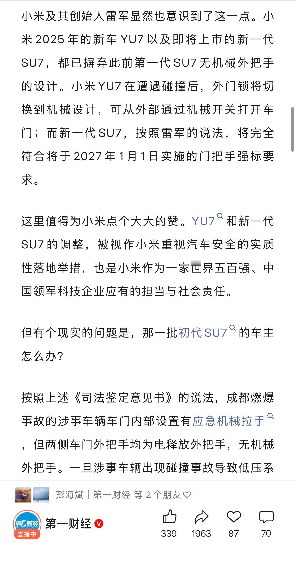 第一财经呼吁,小米应主动召回37万辆初代小米SU7,以解决其车门外把手没有机械释放功能所存在的安全隐患