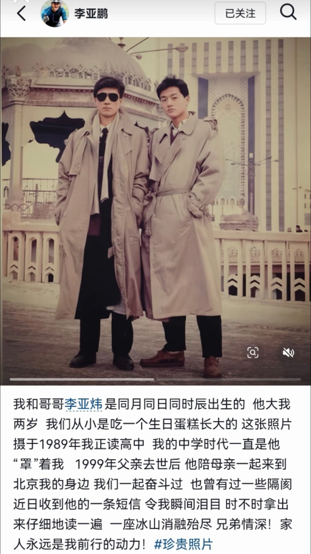 李亚鹏官宣与哥哥和解正月初十,李亚鹏分享和哥哥李亚炜的聊天记录。。原来兄弟俩曾有一些隔阂后来终于心结解开哥哥李亚炜的信息内容让人泪目“作为哥哥我居然这么的不了解你…”神奇的是李亚鹏与哥哥李亚炜相差两岁,但是同月同日甚至同时辰出生李亚鹏称“我们从小是吃一个生日蛋糕长大的…”手足情深!误会解除了就好