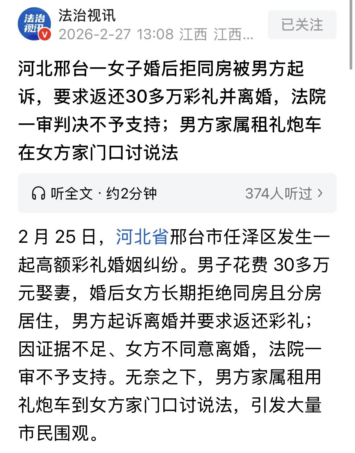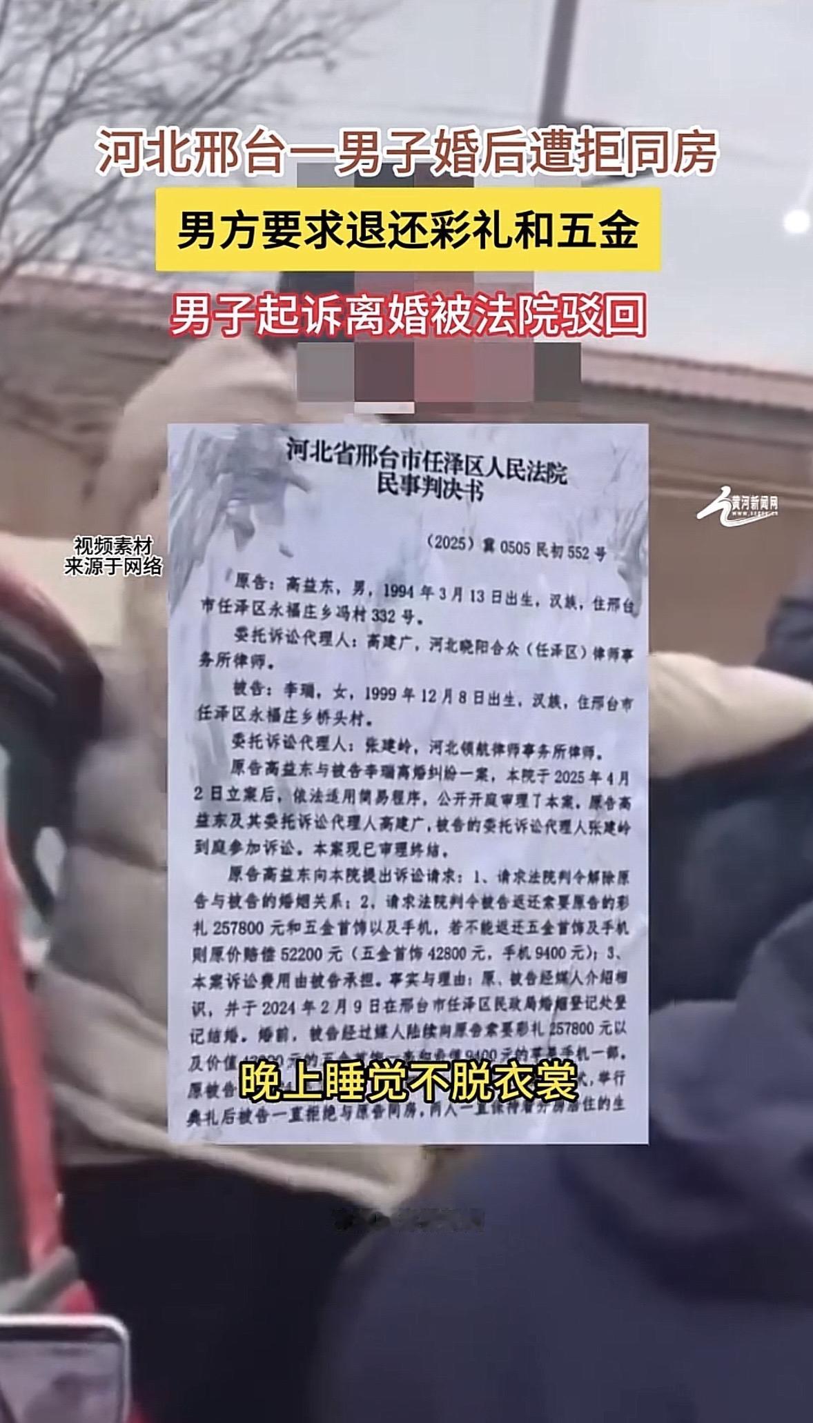 河北邢台,男子花30万把妻子娶进门,可妻子婚后10个月一直拒绝同房,像防贼似的防他,不仅分房睡,甚至睡觉从来不脱衣服,男子过不下去了,诉至法院提出离婚,要求女方退还全部彩礼,却败诉了,这下想离离不掉,想过过不成,男子一家郁闷了,直接租了辆礼炮车去女子家门口讨说法。 2024年春节,老张一家特别热闹。 大年三十刚过,正月里还没出,儿子小强的婚事就办了。 这门亲事是媒人牵线搭的桥,典型的相亲。女方小莉长相端正,看着也老实。 老张家为了娶这个儿媳妇,出手阔绰,现金彩礼直接给了257800元, 金镯子、金项链等“五金”又花了42800元,还专门买了个最新款的手机,9400元。 这一通操作下来,30多万砸进去了。 俩人2月9号领证,2月22号办酒席,一切都很顺利。 按照当地习俗,结婚头几天小两口得回门,然后就是甜甜蜜蜜过日子了。 可小强发现,这小莉自从进了门,就像个“客人”。 白天还好,一到晚上,小莉就像防贼一样防着小强。分房睡那是基本操作,甚至连一张床都不愿意挨。 小强哪怕只是想拉个手,都会被小莉冷冷地甩开。 更让小强心里不理解的是,小莉晚上睡觉从来不脱外衣,连袜子都穿得整整齐齐,白天也就那两身衣服换着穿,根本不像是要在这个家里长住过日子的样子。 小强憋屈得不行,私下里没少跟母亲抱怨,满肚子的委屈没法说。 他想着可能是刚结婚害羞,想着法儿地对她好,买菜做饭、端茶倒水,可小莉依旧是一副冷若冰霜的样子,问十句答一句,甚至干脆不理。 这种日子,小强硬着头皮忍了10个月。 这10个月里,老张家的亲戚朋友也看出了不对劲。有人劝小强:是不是有啥误会?好好聊聊。 可小强一开口,小莉要么沉默,要么就一句话:没误会,不想过。 最让老张一家崩溃的是,当他们提出既然过不到一块去,就把彩礼退了,好聚好散时,小莉的态度来了个一百八十度大转弯,坚决不离! 那老张一家肯定不乐意啊,这儿媳既不履行夫妻义务,又霸占着妻子的名分,还死死咬住那30多万不松口,这不就是奔着钱来的吗?当他们傻呐! 2025年初,小强实在是绷不住了。这不仅是钱的问题,更是尊严的问题。 他一纸诉状递到法院,诉求就是:离婚,还钱。 法庭上,小强把这十个月的憋屈全倒了出来:长期分居、拒绝同房、甚至连基本的夫妻交流都没有。他觉得这婚姻就是个空壳,是个骗钱的局。 法官看着手里的证据,也是皱眉头。虽然小强说得头头是道,但在法律上,“长期分居”和“拒绝同房”这种事儿,如果没有录音、视频或者第三方证人,很难形成完整的证据链来证明“夫妻感情确已破裂”。 再加上小莉咬死了不同意离婚,按照《民法典》的规定,第一次起诉离婚,如果对方坚决不同意,且没有法定判离的情形,比如家暴、重婚,法院通常会驳回诉求,给双方一个和好的机会。 结果毫无悬念:驳回离婚诉讼请求。 判决书下来那天,小强家里人崩溃了。钱没了,人还被套牢了,想离离不掉,想过过不成。 这事儿很快在十里八乡传开了,网上更是议论纷纷。有人骂小莉是职业骗婚,也有人同情小强人财两空。 但最让大家看不懂的是小莉的操作:既然不想好好过,为什么不离?既然不离,为什么又要把丈夫拒之门外? 如今,法院判了不准离,相关部门正在介入调解。小强一家愁得睡不着觉。 被逼无奈之下,小强一家只能租了几辆礼炮车到女方家门口讨说法,这下是闹得彻底人尽皆知了。 《最高人民法院关于审理涉彩礼纠纷案件适用法律若干问题的规定》第5条规定:双方已办理结婚登记且共同生活,离婚时一方请求返还按照习俗给付的彩礼的,人民法院一般不予支持;但是,如果共同生活时间较短且彩礼数额过高的,人民法院可以根据彩礼实际使用及嫁妆情况,综合考虑彩礼数额、共同生活及孕育情况、双方过错等事实,结合当地习俗,确定是否返还以及返还的具体比例。 虽然法院目前因证据不足驳回了离婚诉求,但这并不代表男方无法追回彩礼。 即便双方领了证,如果“共同生活时间较短”且“彩礼数额过高”,法律支持返还。 男方花费超30万元,对于普通家庭属于“数额过高”。而女方婚后长期分房、拒绝同房、甚至睡觉不脱衣,这在法律评价上属于“未形成实质共同生活”。 这个法条的立法本意正是为了打击借婚姻索取财物的行为,避免人财两空。 因此,即使第一次起诉离婚被驳回,男方完全可以在后续诉讼中,依据此条重点主张:这30万元是基于“长久共同生活”的目的给付的,现女方拒绝履行夫妻义务导致目的落空,且彩礼造成男方家庭困难,理应大部分返还。 对于小强来说,接下来的路更难走。要么搜集到更硬的证据,等6个月后再次起诉。 要么就得在这段名存实亡的婚姻里继续耗着,直到一方彻底崩溃。 对此,你怎么看? 关注@运良说法 学法律知识不迷路