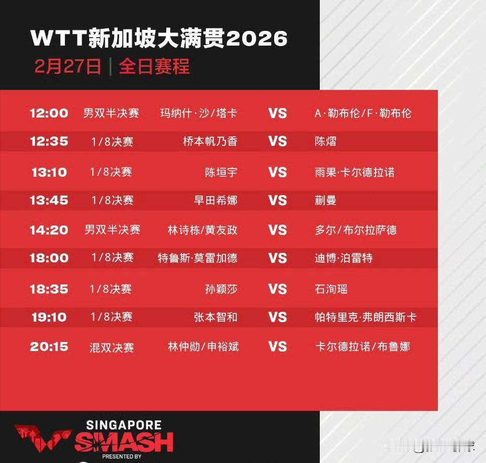 WTT新加坡大满贯2026男双半决赛、女单1/8决赛赛果 男双半决赛 F·勒布伦/A·勒布伦(FRA)3-2塔卡/玛纳什·沙(IND)【11-6,7-11,12-10,9-11,11-8】 林诗栋/黄友政(CHN)3-0多尔/布尔拉萨德(FRA)【11-5,13-11,11-9】 女单1/8决赛 陈熠(CHN)3-0桥本帆乃香(JPN)【11-3,11-5,11-9】 早田希娜(JPN)3-2蒯曼(CHN)【11-7,12-10,4-11,7-11,13-11】 男单1/8决赛 陈垣宇(CHN)3-1雨果·卡尔德拉诺(BRA)【6-11,11-9,12-10,11-9】