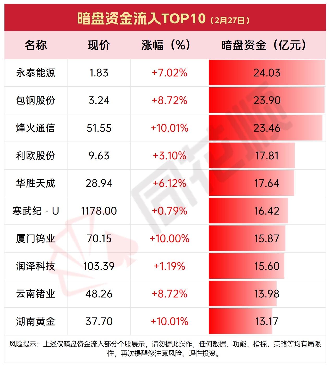 2月27日暗盘资金流入TOP10,揭秘股市黑马! 股市暗盘资金流向活跃,永泰能源、包钢股份等个股涨幅显著,资金流入居前。理性投资,警惕风险。