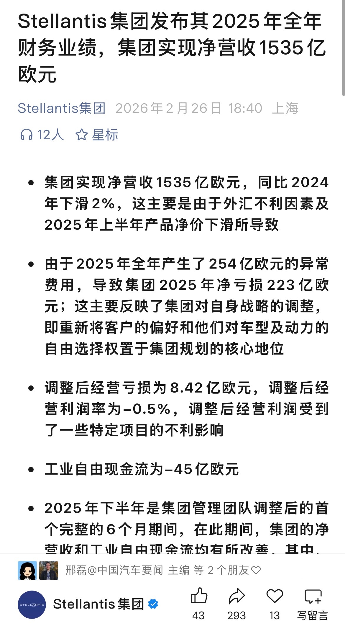斯泰兰蒂斯集团2025年亏损223亿欧元,由于2025年全年产生了254亿欧元的异常费用,导致集团2025年净亏损223亿欧元;这主要反映了集团对自身战略的调整,即重新将客户的偏好和他们对车型及动力的自由选择权置于集团规划的核心地位