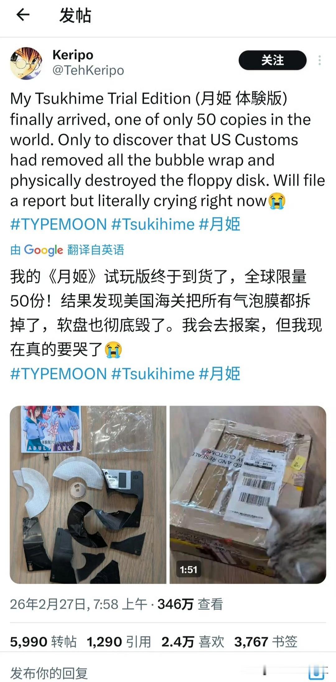 国外网友发帖吐槽,我的《月姬》试玩版终于到货了,全球限量50份!结果发现美国海关把所有气泡膜都拆掉了,软盘也彻底毁了。我会去报案,但我现在真的要哭了 现在日本游戏还在用软盘,这个太复古了!