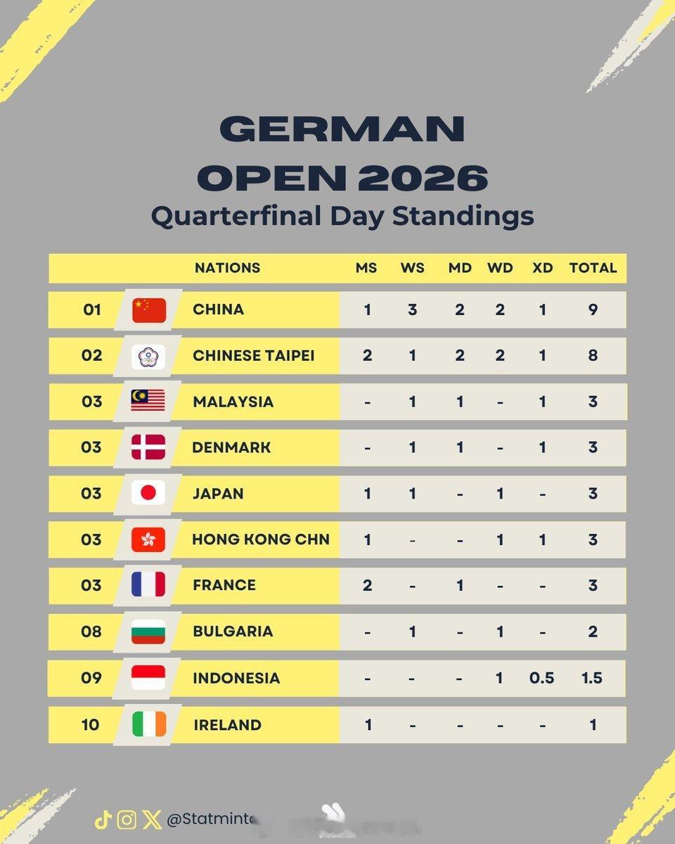 2026年德国羽毛球公开赛各协会八强席位分布中国队🇨🇳以9个八强席位位列第一