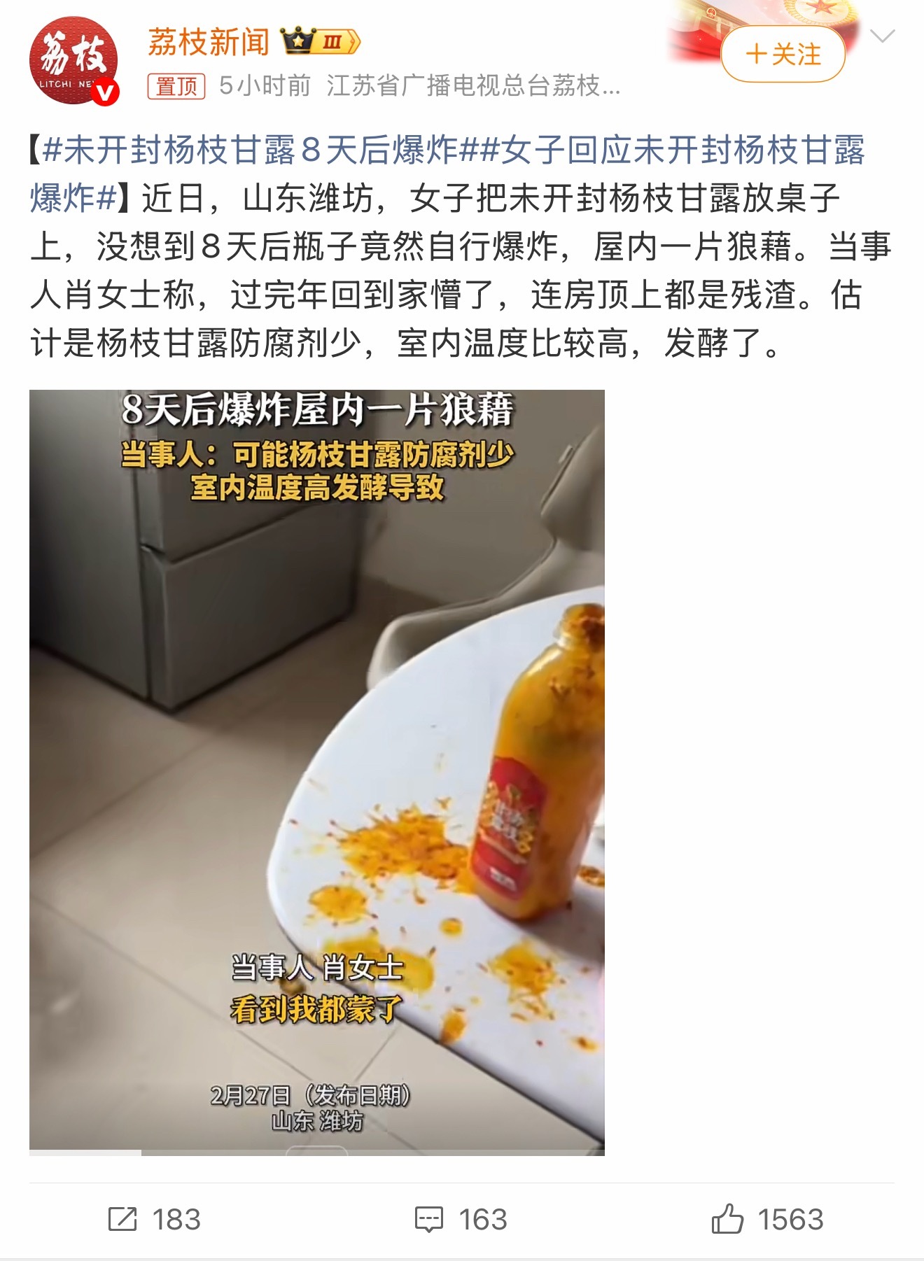 未开封杨枝甘露8天后爆炸很简单,坏了,变质了 ,细菌发酵产生气体爆炸了,杨枝甘露本来就是要放在冰箱里储存的,一般也写了储存条件,0-4度冷藏,请勿脱离冷藏30分钟以上