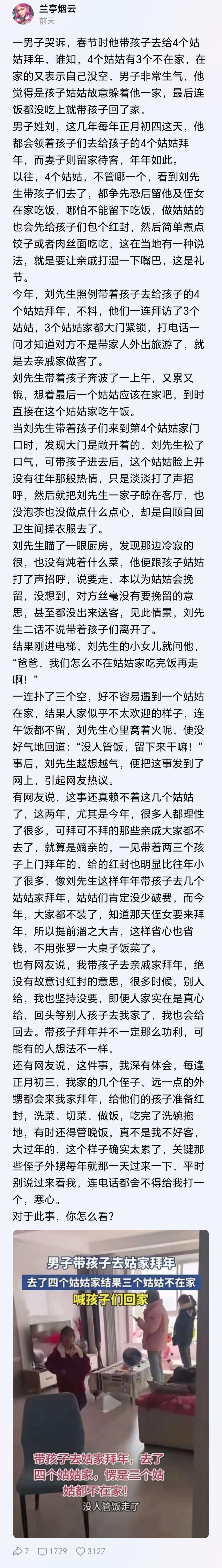 一个姑姑不见说明姑姑有问题,三个姑姑不见,就说明这个男人有问题,还有一个姑姑见面不管饭,更说明这个男人有大问题。