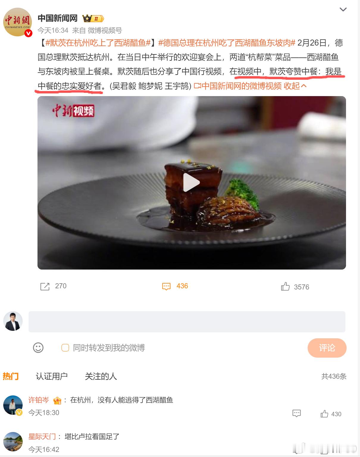 德国总理在杭州吃了西湖醋鱼东坡肉