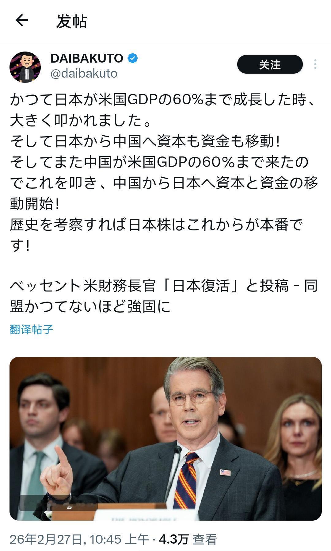 被贝森特带了一句,日本人又高潮了 被美国财长一句 “日本复活” 一捧,不少日本人立刻陷入自我感动。 有人搬出老剧本:当年日本被美国打压,资本去了中国;如今中国被打压,资本就该回流日本,股市要大涨。典型的刻舟求剑、守株待兔。 当年日本产业转移中国,是成本倒逼、主动自救,不是被迫逃亡。如今中国体量、工业体系、主权独立性,远非当年日本可比。美国自身债台高筑,多处依赖中国,早已没当年随意拿捏的实力,更谈不上让资本大规模从中国流向日本。 没有想到有不少日本人竟然沉浸在 “风水轮流转” 的幻想里,盼着别人跌倒自己上位,阿Q是移民日本去了? 原推译文: 过去,当日本经济增长到美国 GDP 的 60% 时,遭到了美国的沉重打击。 然后资本和资金从日本流向了中国! 现在,当中国经济也达到美国 GDP 的 60% 时,又遭到了打压,于是资本和资金开始从中国流向日本! 从历史来看,日本股市接下来才是真正的重头戏! 贝森特(美国财长)发文称 “日本复活”—— 同盟关系比以往任何时候都更加牢固。 Source: X