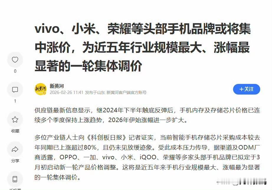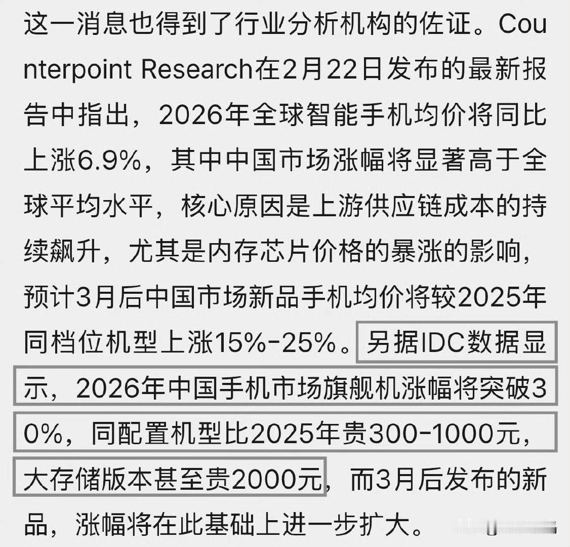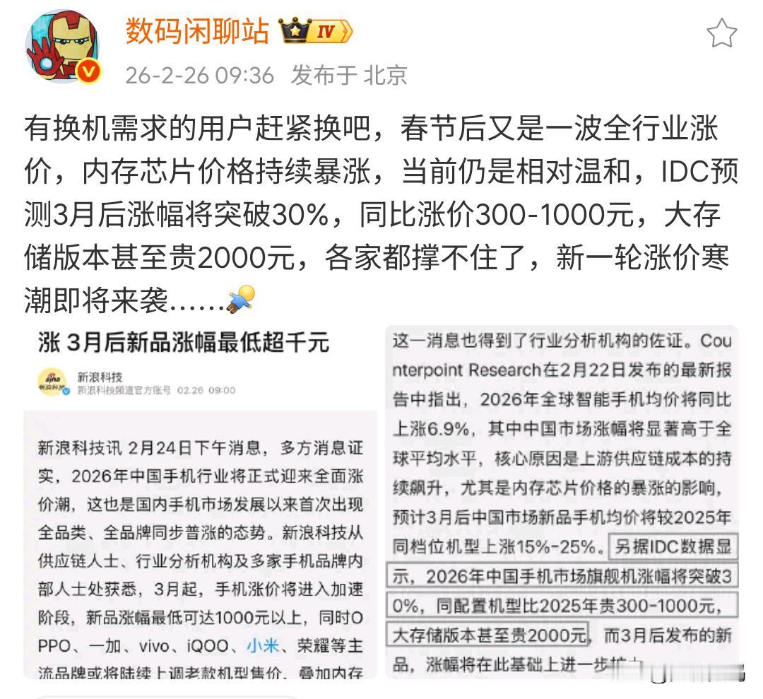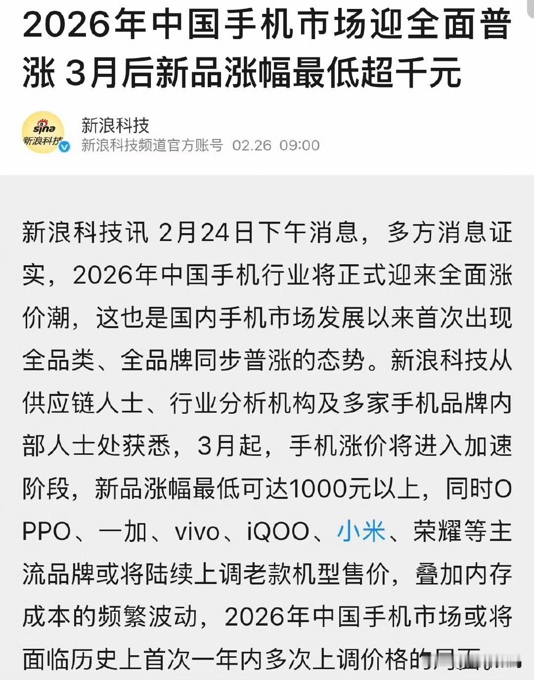 不开玩笑!今年要买手机的请趁早,因为真的要涨价啦! 从去年年底部分新机发布我们就可以看出,上游供应链涨价明显,厂家成本压力很大(内存和芯片涨得实在太猛了)。 所以我们看到今年的新机要么缩水配置维持原价,要么就涨价稳步提升。像前几年那种2000多就有512G、1T大存储,甚至还普及24G运存的盛况是不再有了。厂家些一个个都在发声抱怨成本太高了,去年的一些性价比高的机型纷纷停产换代(换壳)涨价。 之前各大厂家还压的住是因为手里屯了一些库存,并且想撑一撑拖一拖,看看能不能熬过去。但是现在看来,存储颗粒最早也要到2027年才有降价的迹象,所以手机厂家纷纷顶不住,准备涨价了(手机厂家也顶不住,卖得越多亏得越多,调高售价意味着自己也降低销量预期了)。 多家媒体报道,3月起,手机涨价开始加速,将引来全面涨价潮。特别是后面的新品大折叠、Ultra等机型涨价幅度最低1000元起(大存储版本甚至要贵2000元)。vivo、OPPO、一加、小米、荣耀等国内主流品牌都将陆续上调老款机型售价,照这个趋势下去,我看连果子怕也顶不住,会上调iPhone售价。 所以大概率今年手机市场是这样子: ①、还没发布的新品,没利润的直接砍掉,准备发布的新品会涨价不少,越高端的机型涨价越多(普通点的机型涨价300-500,旗舰机涨价幅度怕是800-1000打底)。 ②、去年年底到现在已经发布的新品,这部分大概率会上调售价,平掉成本。 ③、去年发布的老机型(现在发布机型的上一代(还在售的)),性价比还不错的那种,大概率会停产,然后迭代小改款+涨价。 目前只有Apple的议价能力强一点,但我感觉成本再往上涨果子也会顶不住,一方面果子把利润率看得比较重,另外就是果子售价本就不便宜,再涨一点也有人买。所以想入手iPhone17标准版的,我也劝你趁早,这手机要是一涨价就超过6000块,连国补都用不了,一加(价)一减(国补),那就亏得更多了。 照这个趋势,今年618肯定是没啥优惠降价了,能维持住现有价格就很不错了,所以现在有换机需求的赶紧趁早买(毕竟还有国补),没有换机需求的那就别碰,上游厂家喜欢涨价那我们就等,等它降价,绝不惯着。