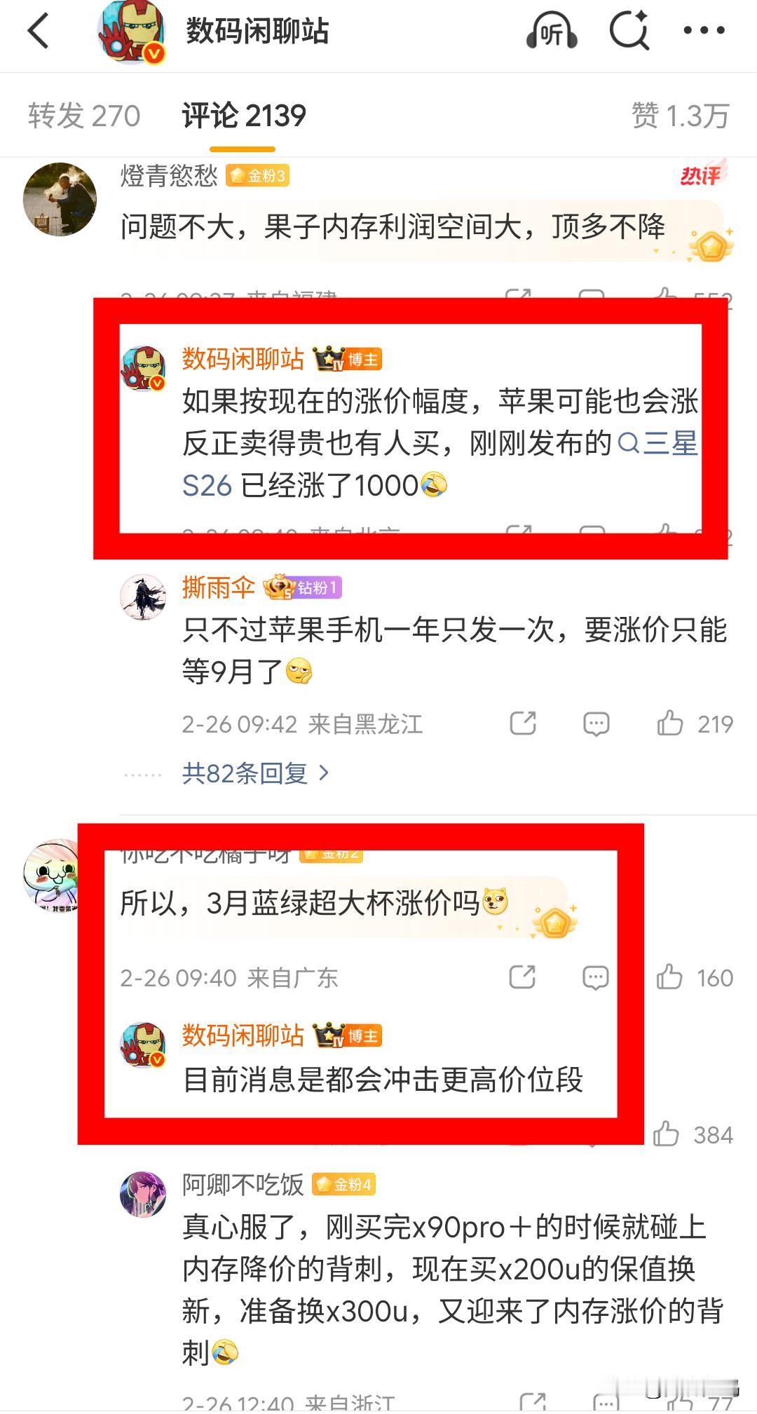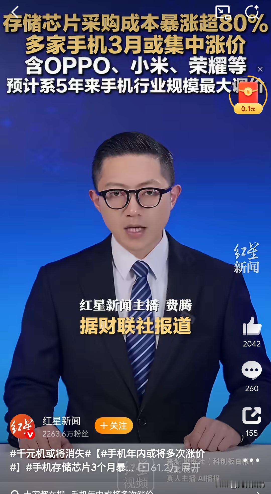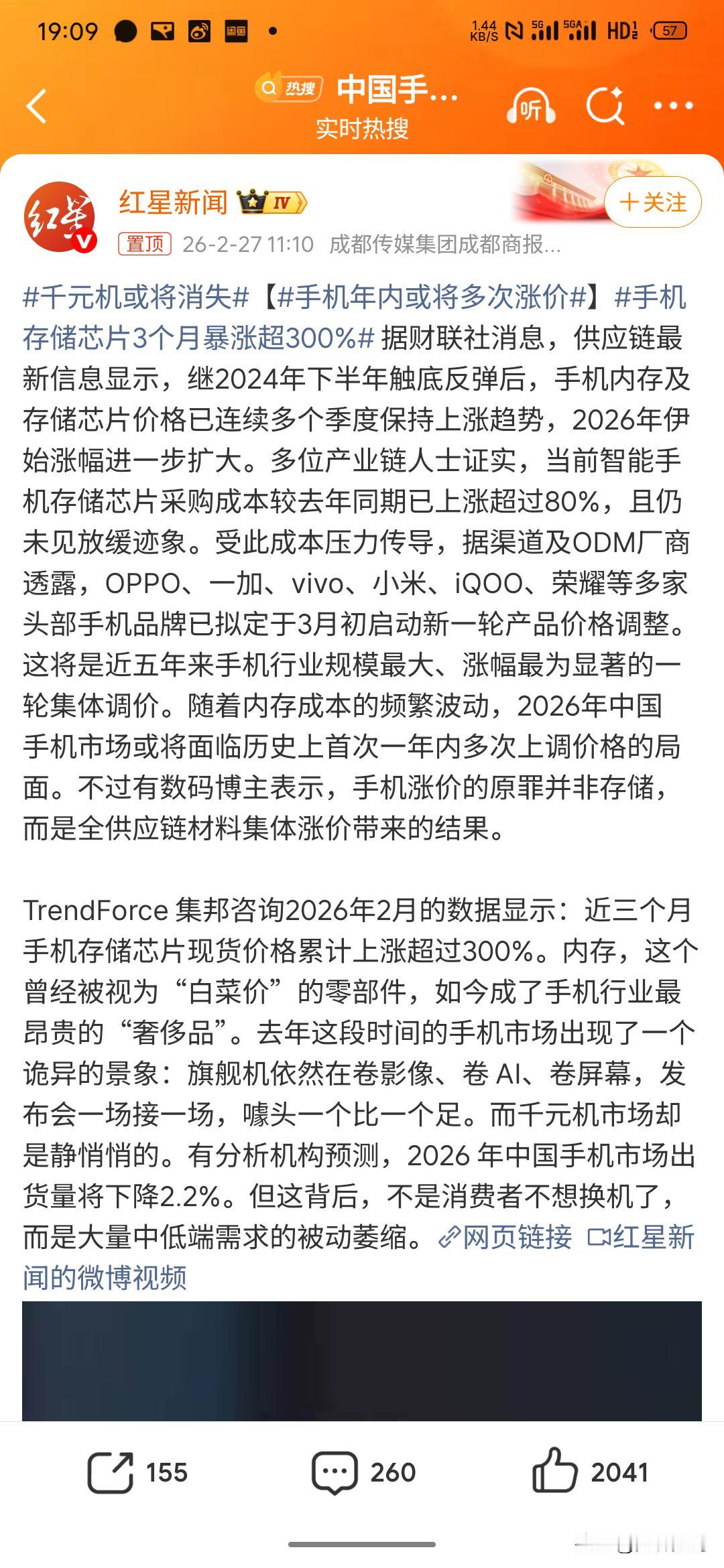 不开玩笑!今年要买手机的请趁早,因为真的要涨价啦! 从去年年底部分新机发布我们就可以看出,上游供应链涨价明显,厂家成本压力很大(内存和芯片涨得实在太猛了)。 所以我们看到今年的新机要么缩水配置维持原价,要么就涨价稳步提升。像前几年那种2000多就有512G、1T大存储,甚至还普及24G运存的盛况是不再有了。厂家些一个个都在发声抱怨成本太高了,去年的一些性价比高的机型纷纷停产换代(换壳)涨价。 之前各大厂家还压的住是因为手里屯了一些库存,并且想撑一撑拖一拖,看看能不能熬过去。但是现在看来,存储颗粒最早也要到2027年才有降价的迹象,所以手机厂家纷纷顶不住,准备涨价了(手机厂家也顶不住,卖得越多亏得越多,调高售价意味着自己也降低销量预期了)。 多家媒体报道,3月起,手机涨价开始加速,将引来全面涨价潮。特别是后面的新品大折叠、Ultra等机型涨价幅度最低1000元起(大存储版本甚至要贵2000元)。vivo、OPPO、一加、小米、荣耀等国内主流品牌都将陆续上调老款机型售价,照这个趋势下去,我看连果子怕也顶不住,会上调iPhone售价。 所以大概率今年手机市场是这样子: ①、还没发布的新品,没利润的直接砍掉,准备发布的新品会涨价不少,越高端的机型涨价越多(普通点的机型涨价300-500,旗舰机涨价幅度怕是800-1000打底)。 ②、去年年底到现在已经发布的新品,这部分大概率会上调售价,平掉成本。 ③、去年发布的老机型(现在发布机型的上一代(还在售的)),性价比还不错的那种,大概率会停产,然后迭代小改款+涨价。 目前只有Apple的议价能力强一点,但我感觉成本再往上涨果子也会顶不住,一方面果子把利润率看得比较重,另外就是果子售价本就不便宜,再涨一点也有人买。所以想入手iPhone17标准版的,我也劝你趁早,这手机要是一涨价就超过6000块,连国补都用不了,一加(价)一减(国补),那就亏得更多了。 照这个趋势,今年618肯定是没啥优惠降价了,能维持住现有价格就很不错了,所以现在有换机需求的赶紧趁早买(毕竟还有国补),没有换机需求的那就别碰,上游厂家喜欢涨价那我们就等,等它降价,绝不惯着。