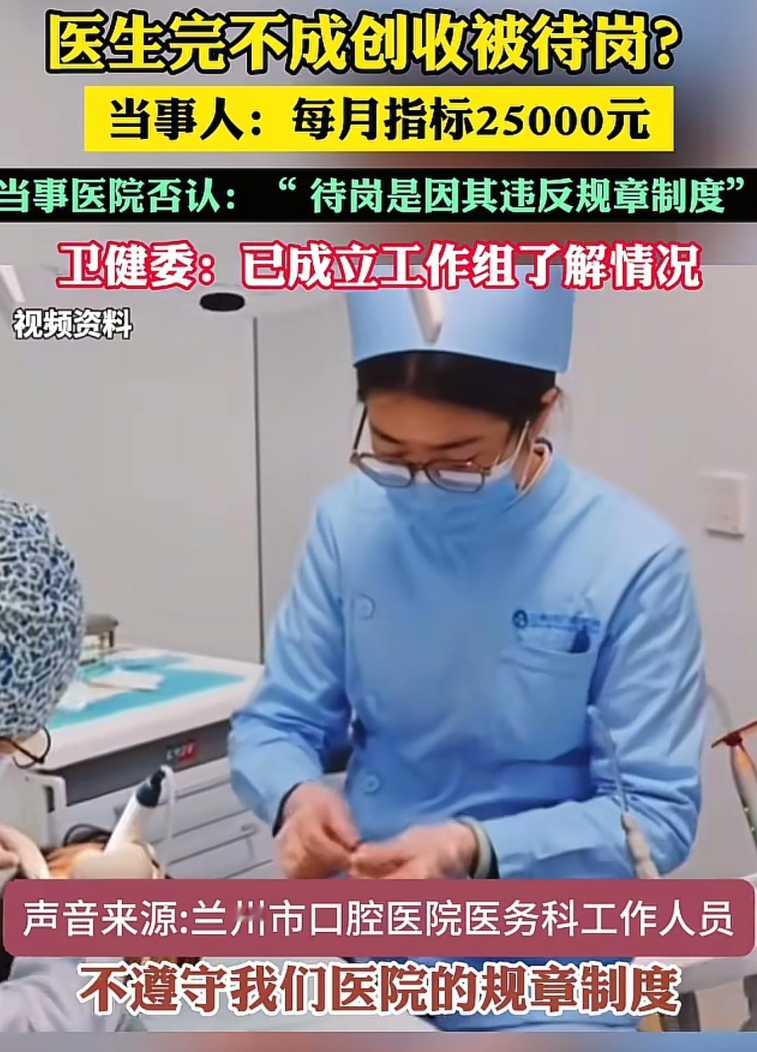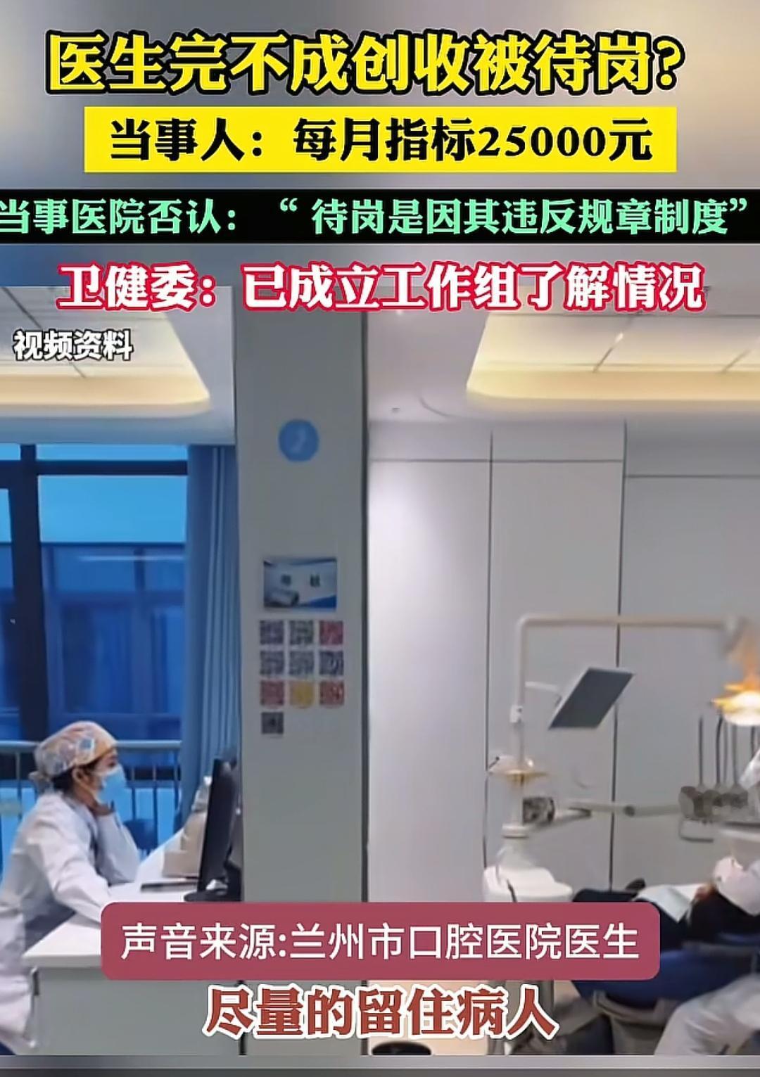 太离谱了!完不成2.5万创收就得待岗!当医生的饭碗,直接和医院创收死死绑在一起,这条夺命KPI一曝光,瞬间炸穿全网舆论!要知道,医生收入跟创收挂钩、饭碗跟业绩捆绑,最可怕的后果, 就是逼得医生小病大治、无病硬治、能做不能做的全给你做,可开可不开的检查全开,可做可不做的手术硬上!医疗一旦沦为赚钱工具,受伤的永远是普通患者!虽然官方通报说得再干脆,老百姓心里的疑团,半分都没消散!我们一起来看看具体的报道! 综合环球网等媒体报道,2月25日,兰州一名医生公开爆料:自己每月被摊派2.5万元创收指标,完不成要向同事“借指标”抵工资,拒绝后直接被待岗;更可怕的是,为冲业绩,诊疗变成“能做就做、留客优先”,医疗底线失守。 舆论炸锅仅数小时,兰州市卫健委火速通报:该院无创收指标、无因此待岗情况,院方称医生是因违规被处理。一边是医生实名讲述细节、数据清晰;一边是官方快速定性、结论干脆。这场“罗生门”,让国家早已三令五申的红线,再次被推到风口浪尖。 国家卫健委等八部门早有明确禁令:严禁给医务人员设定创收指标,严禁薪酬与药品、检查、治疗收入挂钩。从2013年“九不准”到2021年价格改革方案,这条红线一禁就是十几年,白纸黑字、反复强调。可现实中,“暗指标”“隐形KPI”在不少医院仍以绩效、考核之名变相存在。 值得一提的是,涉事的兰州市口腔医院,是差额拨款事业单位,256名职工中编外占130人。财政补贴不足、运营压力大,很容易把成本转嫁给一线医生,再由医生转嫁给患者。 当医生工资绑着业绩,看病就会变味:可做可不做的治疗全做、可开可不开的检查全开,最终买单的,还是每一个普通患者。 诚然,官方通报澄清事实,是必要的程序,但更要回应公众最关心的三个问题:第一,医生口中2.5万月指标、借指标抵工资,是编造还是有迹可循?第二,待岗的真实原因,能否拿出完整依据?第三,医院绩效考核方案,是否与收入彻底脱钩? 眼下,一句“没有”容易服众难。医疗是民生底线,公立医院姓“公”不姓“利”。如果一边喊着禁止创收,一边用业绩压医生;一边说规范诊疗,一边让患者为不合理费用买单,医患信任只会越来越薄。对于此事,大家怎么看呢?