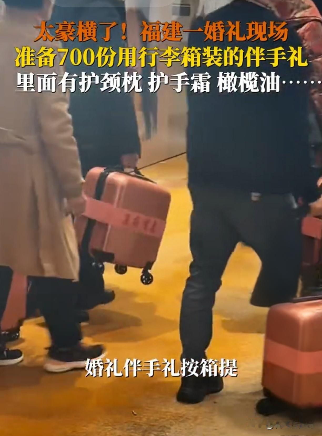 福建福清婚礼太豪横!700份伴手礼按箱提,还不收礼? 🤩 2月25号,福建福清有一场婚礼直接把我看傻了! 💥 别人婚礼发伴手礼都是小手提袋,顶多一个小礼盒。这家倒好,直接上行李箱!对,你没听错,就是咱们平时出差用的那种行李箱,宾客们在现场排着队,人手一箱直接提着走 。 这排面,谁看了不得愣一下? 我专门去扒拉了一下细节,负责定制伴手礼的俞女士说,现场一共准备了700份这样的行李箱伴手礼 。700份啊朋友们,这哪是办婚礼,这简直是在搞年货批发! 更绝的是箱子里的东西,主打一个实在。 不像有些婚礼,盒子老大,打开全是泡沫和几颗糖。这家的行李箱里,装的都是硬通货:做饭用的橄榄油、睡觉用的护颈枕、冬天必备的护手霜,还有小孩子爱吃的蛋卷零食 。用咱们老百姓的大白话讲,这就是“拎回家就能用,绝不落灰”。 看到这里,你是不是觉得这家新人肯定收礼金收到手软? 反转来了!也是让我最破防的一点——人家新人不仅不收礼金,据说还给到场的亲戚朋友发红包! 这就有点“离谱”了啊。 咱们平时随份子,那都是人情往来。你出500,我记在账本上,改天还你。但福清这场婚礼的新人,直接打破了这种“交易感”。他们这波操作,翻译过来就是:今天是我大喜的日子,我发自内心高兴,不仅不要你的红包,我还得送你一箱子好东西,再塞给你一个红包,你只管来吃好喝好,替我开心就行。 说实话,见惯了那种把婚礼当“回收份子钱”的流水席,突然看到这种“倒贴钱”的婚宴,心里真的咯噔一下。 这哪是炫富啊?这分明是把人情世故的压力,转化成了单纯的喜悦和分享。那个护颈枕,可能寓意着“枕”心如意;那瓶橄榄油,可能代表着生活富得流油。这种诚意,比任何花里胡哨的摆拍都打动人。 福建的婚俗,果然从来不会让人失望。 从潮汕的工夫茶到福清的行李箱,这种地域特色背后,藏着的其实是咱们中国人骨子里最讲究的“体面”和“情义”。 最后我想问问大伙儿: 你觉得这样的伴手礼怎么样?如果是你,你会提着这个行李箱去参加婚礼吗? 或者你老家那边有什么特别“硬核”的婚俗?欢迎在评论区晒出来,咱们看看哪个地方的最豪横! 👇 福建婚礼伴手礼按箱提 福清婚俗 婚礼伴手礼天花板 实在