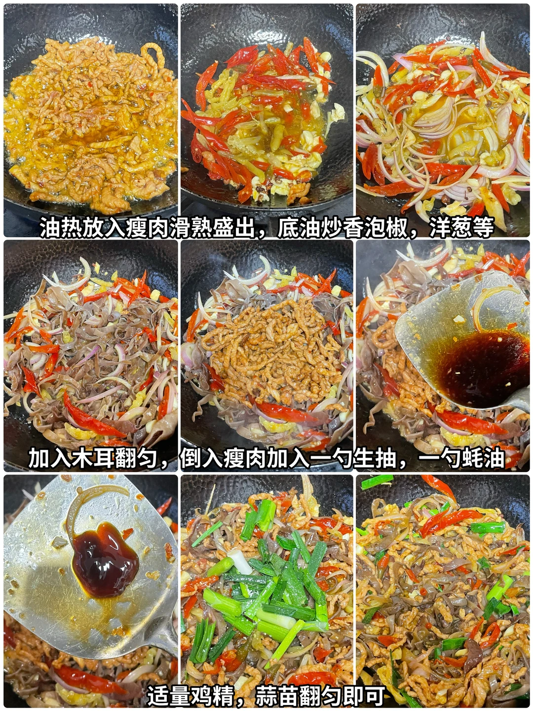 3⃣️起锅烧油,油热将瘦肉滑熟,盛出锅里的底油,炒香泡椒、蒜、花椒,然后放入洋葱炒出香味,加入木耳翻匀。再倒入瘦肉,放入1勺生抽、1勺蚝油、适量的鸡精和蒜苗,翻匀即可出锅。因为泡椒盐味够重了,再加上佐料的盐味,所以我出锅之前尝了一下就不需要盐。姐妹们可以尝试一下,如果出锅之前淡了,可以再加一些适量的盐。喜欢的姐妹去做做吧。