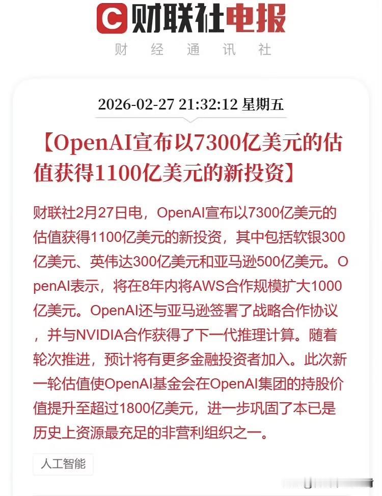 OpenAI这1100亿美元的融资真的拿到了。 这绝对是科技圈值得记录的一件大事…… 其中,软银投300亿美元、英伟达投300亿美元、亚马逊投500亿美元。 OpenAI的估值已经高达7300亿美元。 怪不得总有人怀疑AI泡沫化,这些数字看起来确实有点触目惊心。 而与此同时,还有一个非常重要的消息是,中国的大模型调用量已经超过了美国(图二)、并且是有加速上行的趋势…… 虽然大家都“烧钱”,但相对而言,国内的AI们,相对还是收敛许多了,即便是刚刚结束了春节红包大战。
