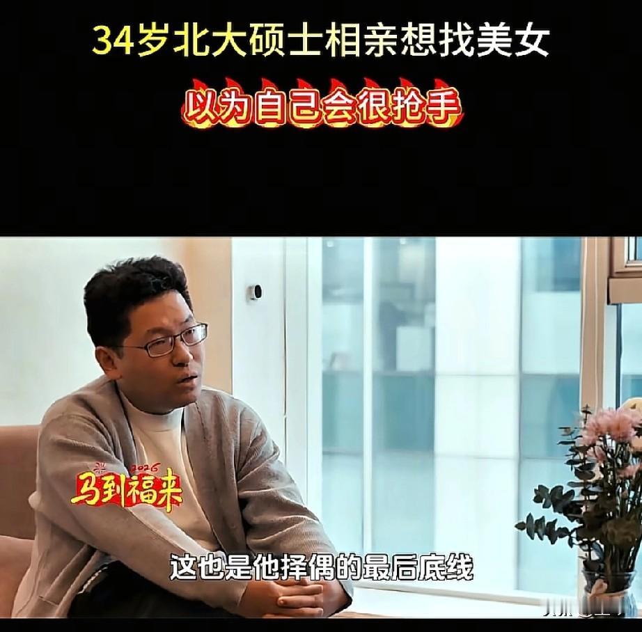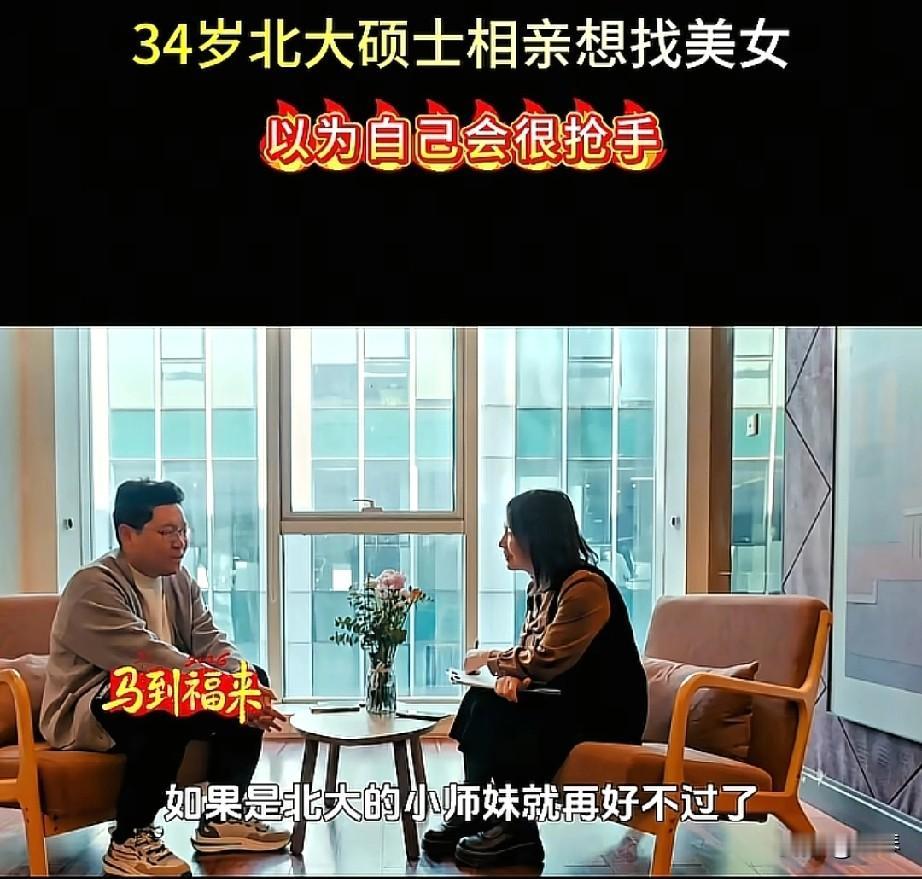34岁北大博士想找18岁颜值小姑娘,却在相亲角屡屡碰壁,迷之自信的样子是金钱给的勇气吗? 没错,这位叫舒克的34岁北大硕士,确实是典型的“迷之自信”代表。 他的自信主要来自: - 北大硕士学历 + 北京两套房,自认为是相亲市场“香饽饽”。 ​ - 择偶标准离谱:要18岁美女、最好是北大小师妹,还要求女方能在北京独自付首付。 ​ - 自己颜值、身高都很普通,却对另一半的外貌和经济条件要求极高。 结果就是,他在相亲中屡屡碰壁,现实狠狠打了他的脸。这种自信,本质上是把学历和房产当成了婚恋市场的“硬通货”,却忽略了感情里更重要的东西——比如共情能力、情绪价值和对他人的尊重。 相亲