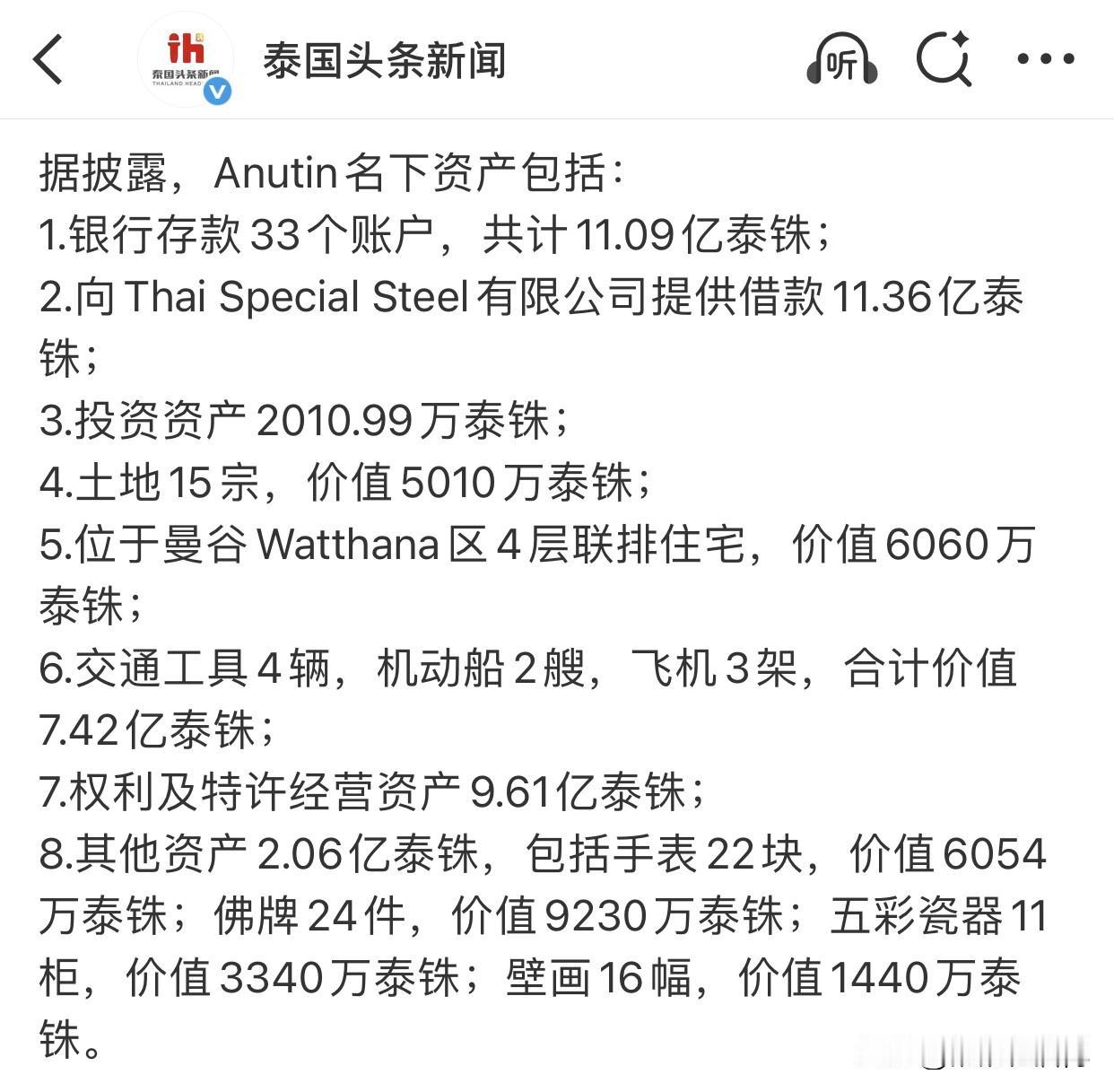 太意外了!泰国政坛突爆大瓜!阿努廷财产公开,身家直接看傻所有人!2月24日,泰国国家反腐败委员会公布最新一批政治人物财产申报,刚刚卸任的阿努廷一亮相,直接引爆全网热议。 他的身家清单一亮相,总资产超过33.6亿泰铢(约合7.4亿人民币),有趣的事情在于,阿努廷的资产缩水了,较之前减少6.18亿泰铢,这个数字直接把很多人给看傻了,远远超出了大家的预估。 这钱到底是怎么个“豪”法?咱们来掰开揉碎了看看。首先,光是银行存款就够吓人的,阿努廷个人在33个银行账户里趴着超过11亿泰铢的现金。这还不算,他借给别人的钱(债权)也有将近1.36亿泰铢。不动产方面,他在泰国各地拥有15块土地,外加曼谷的一处别墅,总价值超过1.1亿泰铢。 但最让人瞠目结舌的,还得是他的“玩具库”。申报清单里显示,他拥有4辆汽车、2艘摩托艇,以及足足3架私人飞机!这些交通工具的总估值高达7.42亿泰铢,其中一架新购入的豪华私人飞机无疑是最大亮点。此外,他名下的各类商标权、特许经营权等无形资产,价值也接近9.6亿泰铢。 你以为这就完了?这位总理的收藏品味也相当“硬核”。他的其他资产里包括22块名表(价值约6050万泰铢)、24尊佛像(约9230万泰铢)、11件泰式五彩瓷器(约3340万泰铢)以及16幅装饰画。这些林林总总的收藏品加起来,又超过了2亿泰铢。相比之下,他妻子的资产约7744万泰铢,就显得“朴实”多了,主要包括一些土地、首饰和一家小咖啡店。 有个细节挺有意思,相比去年6月他辞去副总理职务时申报的近40亿泰铢总资产,这次减少了大约6亿多。减少的部分主要来自投资项,可能是一些投资变现或市值波动。不过,即便“缩水”了,这依然是普通人几十辈子都难以企及的财富规模。 这份清单之所以引发地震般的讨论,不仅仅是因为数字庞大,更是因为它公布的时间点非常微妙。阿努廷目前仍是泰国的看守总理,并且在去年底已正式宣布将作为自豪泰党的总理候选人,参加明年的大选。在这个节骨眼上,如此惊人的财富被透明摊开,公众难免会追问:这些财富的来源是否全部经得起推敲?它与政治权力之间是怎样的关系? 泰国国家反腐败委员会此举本是透明化的一步,但结果却像投入平静湖面的一块巨石。它让一位政治人物的真实财力暴露在阳光下,也必然会在接下来的选战中,成为对手攻击和民众审视的焦点。这瓜,后续恐怕还有得吃。