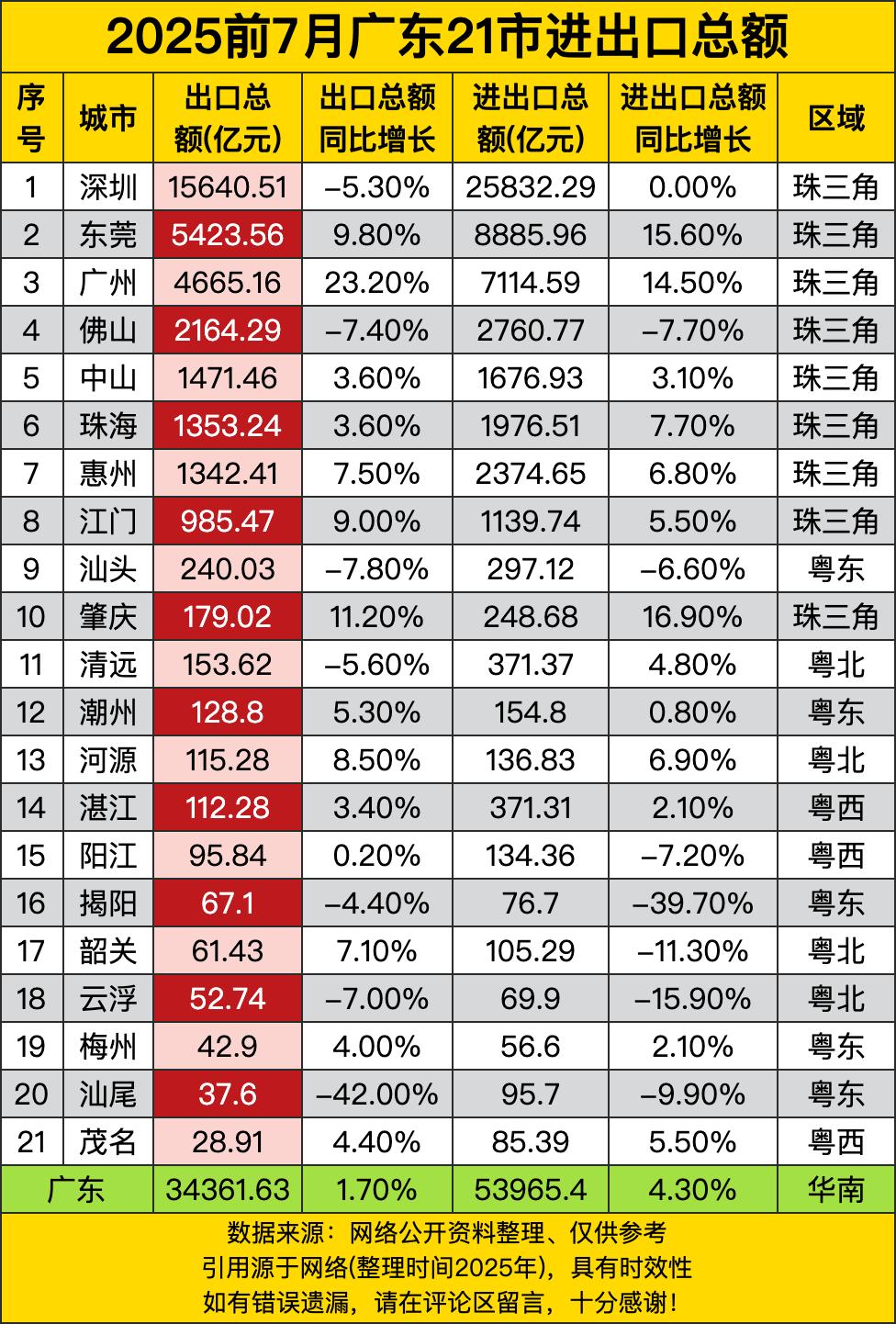 这深圳,那可是老大哥般的存在,出口总额15640.51亿元,虽然同比降了5.30%,但进出口总额依旧高达25832.29亿元,稳稳占据榜首,就像班级里的学霸,偶尔一次小失误不影响大局。不过,这增速不太妙啊,得加把劲咯,不然小心被后面的追上! 再看看东莞和广州,一个同比增长9.80%,一个更是猛增23.20%,这俩就像班里进步飞速的同学,一个进出口总额冲到了8885.96亿元,一个也有7114.59亿元。尤其是广州,这势头太猛啦,仿佛在说:“我要往前冲!”看来在对外贸易的赛道上,它们已经铆足了劲往前跑。 不过呢,也有些城市不太乐观。像佛山,出口总额同比下降7.40%,进出口总额也降了7.70% ,这就有点像学习状态不太好的同学,成绩下滑了。还有汕头、揭阳等城市,进出口数据也不太好看,降幅还不小呢。这些城市可得找找问题,加把劲追赶啦,不然差距会越来越大哟。 最后瞅瞅一些小透明的城市,比如汕尾,出口总额才37.6亿元,进出口总额95.7亿元,增长也是负数。它们就像班级里默默无闻的同学,在对外贸易这块还没发力呢。希望这些城市能重视起来,挖掘挖掘自身潜力,在未来的对外贸易中崭露头角,说不定下一个黑马就是它们哦!