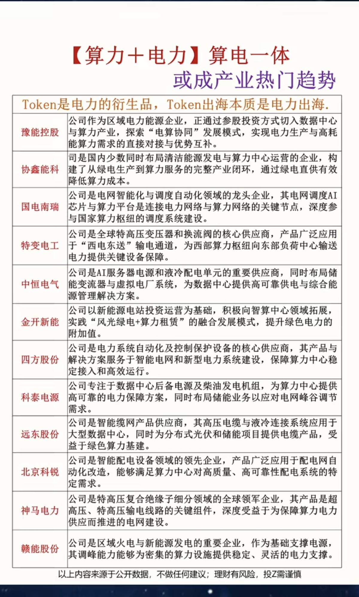 (算力+电力):算电一体或成产业热门趋势! Token是电力的衍生品,Token出海本质是电力出海! 相关核心龙头股;