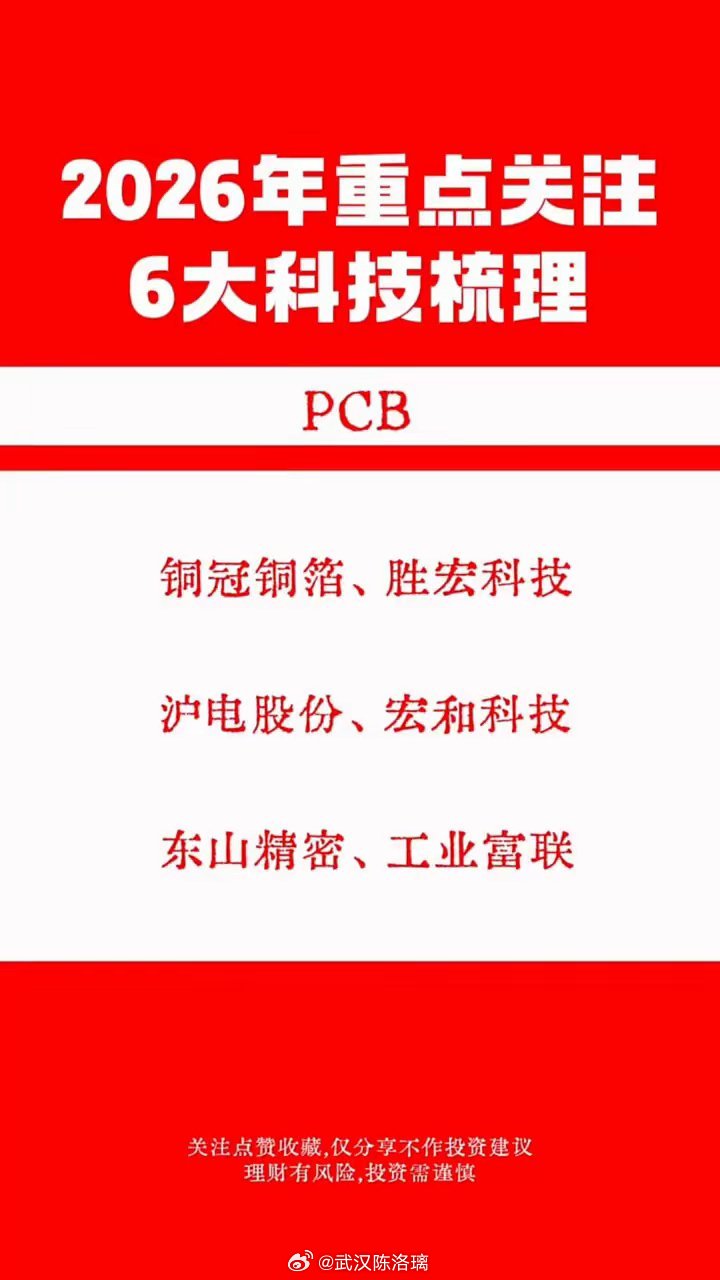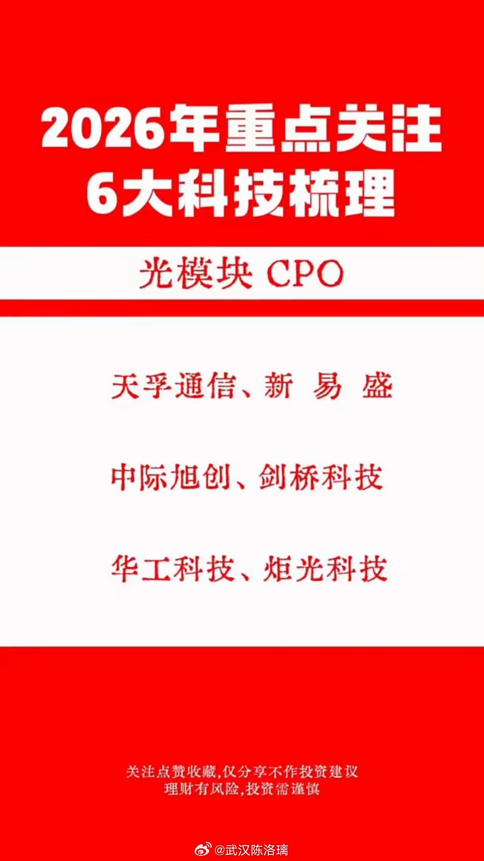 2026年重点关注6大科技梳理·光模块CPO:申菱环境、英维克、沪电股份、宏和科技、华工科技、炬光科技。·存储芯片:香农芯创、佰维存储、江波龙、德明利、兆易创新、朗科科技。·液冷服务器:飞龙股份、冰轮环境。·PCB:铜冠铜箔、胜宏科技、东山精密、工业富联。·谷歌链:赛微电子、德科立、光库科技、腾景科技。