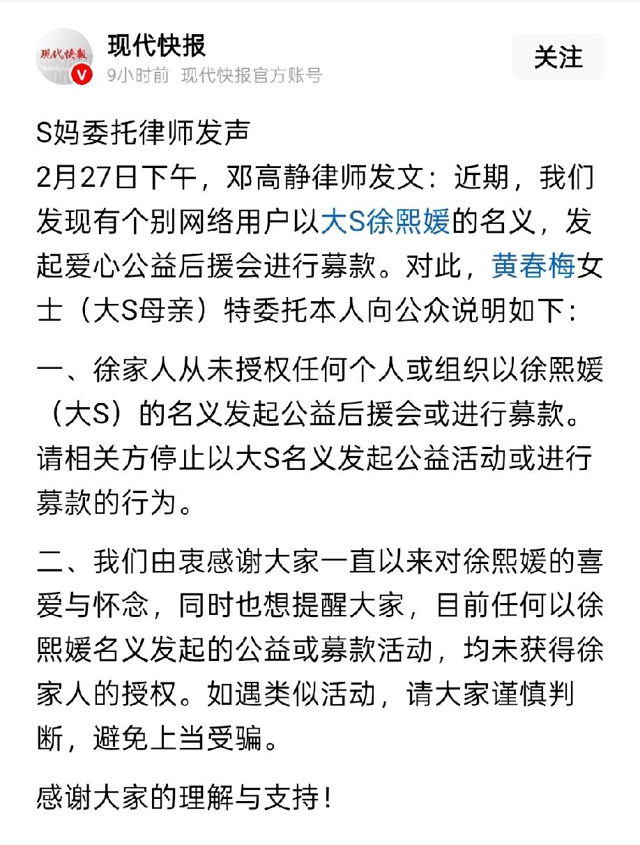 关于S家和汪家的过往恩怨,其实明眼人都能看出来:当事人早已彻底放下,各自安好。 真正还揪着不放、不停消费双方的,反而是那些靠着流量博眼球、蹭热度的人。 昨天S妈委托律师发布声明,主要两件事: 一是感谢大家对大S的喜爱与怀念; 二是澄清徐家从未委托任何机构、个人以大S名义募捐,提醒大家谨防受骗。 这份声明发布得非常及时,也很体面。 恰逢汪家迎来新成员的节点发声,更像是一种温和的态度表达:不纠缠、不拉扯,遵从大S的心愿,放下所有恩怨,专心照顾好孩子。 成年人最好的收尾,从来不是争输赢,而是各自向前,互不打扰。 这次,给S妈点赞!