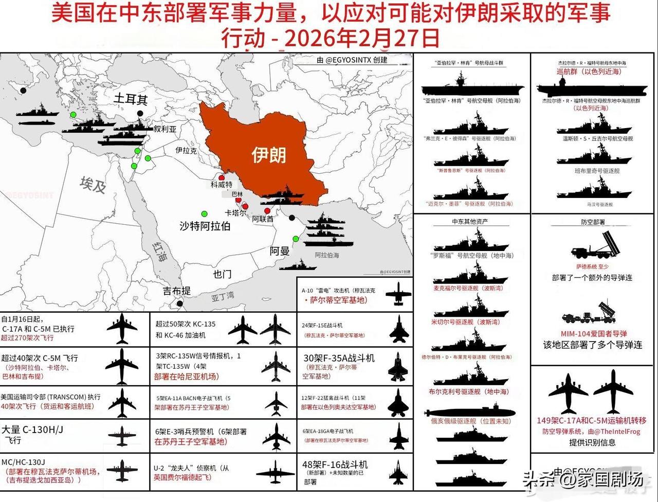 目前有700架飞机包围着伊朗。 其中包括100架第五代隐形战斗机、100架加油机、20架预警机、18架电子战飞机以及两个航母打击群。 加油机已从卡塔尔飞往特拉维夫…… 消息来源:clashreport、EGYOSINT、