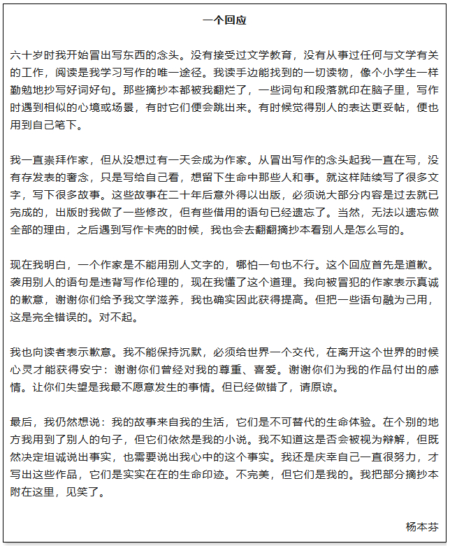 所以,杨本芬的致歉,给那些同样被指出抄袭的作家做出了榜样,但杨本芬的确也要对自己的致歉文本进行再次审视,致歉无需过多的字数与过多的解释,有时候干脆利落、直面事实核心,并给出坚定的改正态度就够了。(撰文:韩浩月)