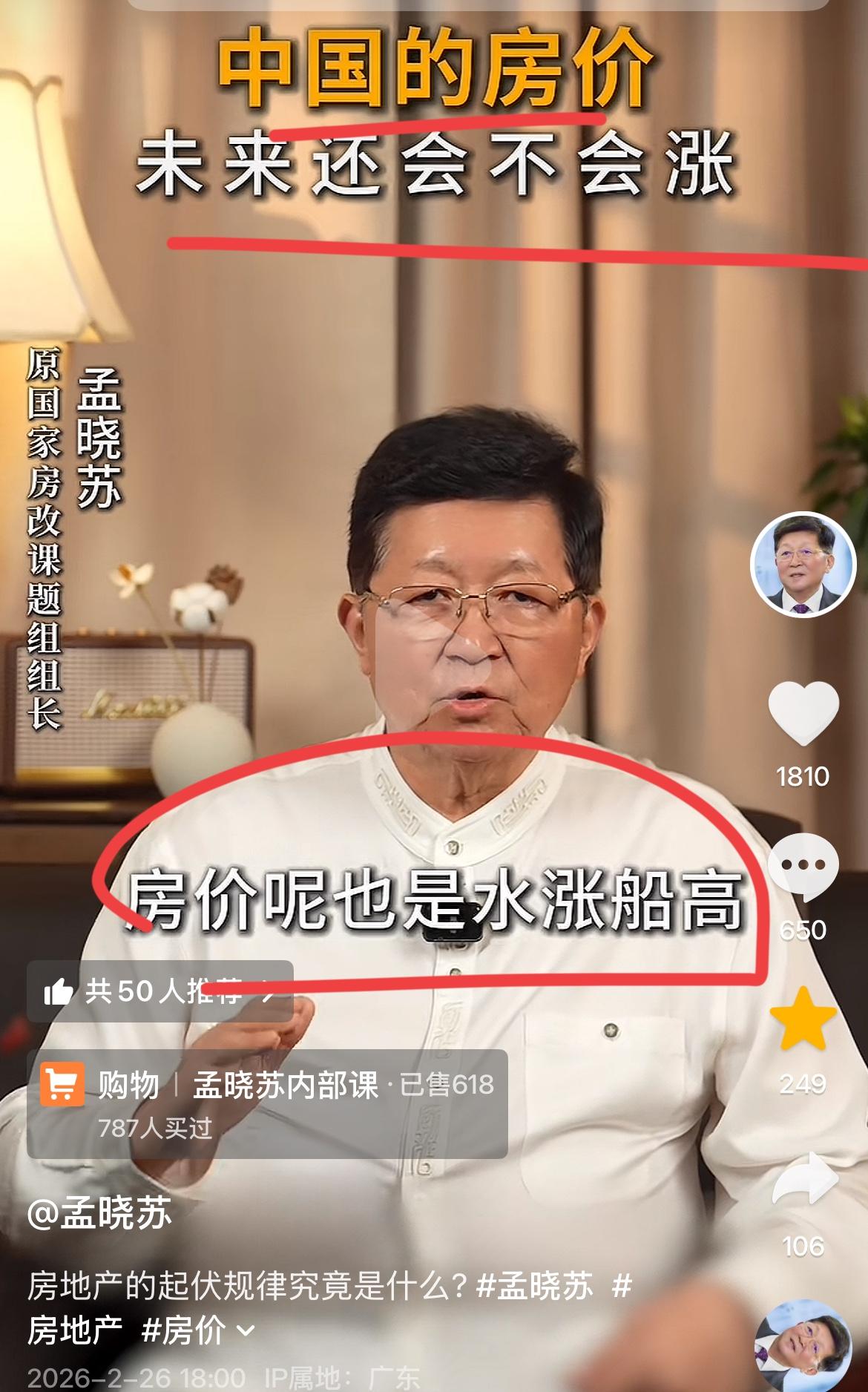 房价还会涨吗?? 著名房地产专家,被誉为中国房地产之父的孟晓苏,给出了他的专业解读。 孟总是原中房集团董事长,房改组组长。 他常年研究中国房地产,对推动房地产业迅猛发展,做出了巨大的贡献。 孟总再次强调,房价不能再跌了,已经跌去了40%; 整个中国房地产市场的规模是450万亿,跌去了40%是什么概念; 就是180万亿的财富不见了,蒸发了,我们一年的GDP才130万亿; 这相当于一年的GDP不见了,开倒亏50万亿。 房地产涉及到上下游180个行业,上亿人的就业和饭碗。 如果再跌,经济怎么快速健康发展呢? 加上地方财政,主要是靠卖地维持,有的地方对土地财政的依赖度是70%以上; 老百姓的主要财富,70也是在房子上,这样跌下去,老百姓财富大幅缩水。 用著名经济学家马老师的话说,这不叫共同富裕,这个变成了共同贫穷。 他们几十年的努力,全部都在房子上了,这么大幅下跌,怎么扛得住,几十年努力白费了。 因此,房价不能跌,只能回稳,甚至涨起来。 孟总还有一个著名的观点,为何老百姓把钱存起来,不消费?不买房? 就是因为信心不足,为何信心不足,是因为害怕房价继续下跌。 怎么才能让老百姓相信房价不再下跌,只需要一招: 让房价涨起来,老百姓就相信不跌了,他们信心回归,就会进场接盘; 只要进场接盘,房地产得救了! 房地产得救,信心回归,财富增加,消费自然起来,经济不就振兴了吗? 专家就是专家,这个逻辑非常严密,形成了闭环!! 你认同专家的观点么,有什么高见呢??