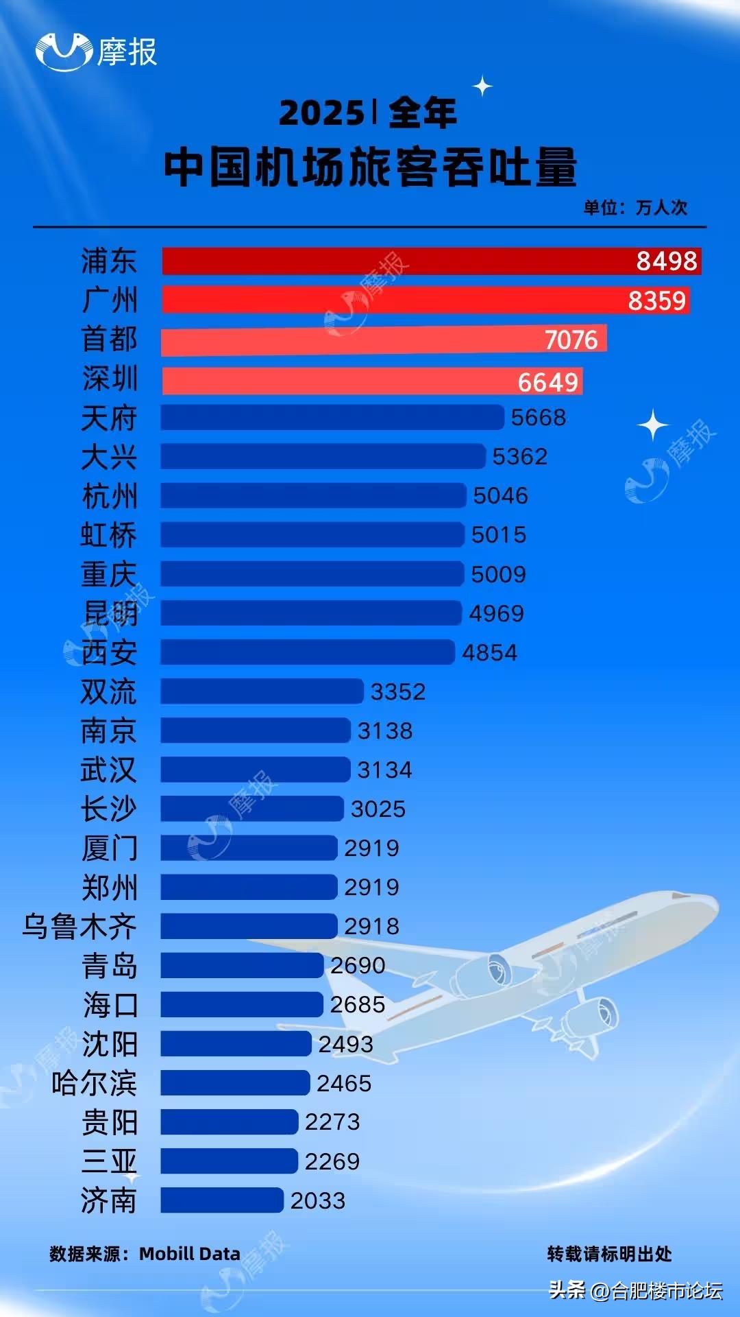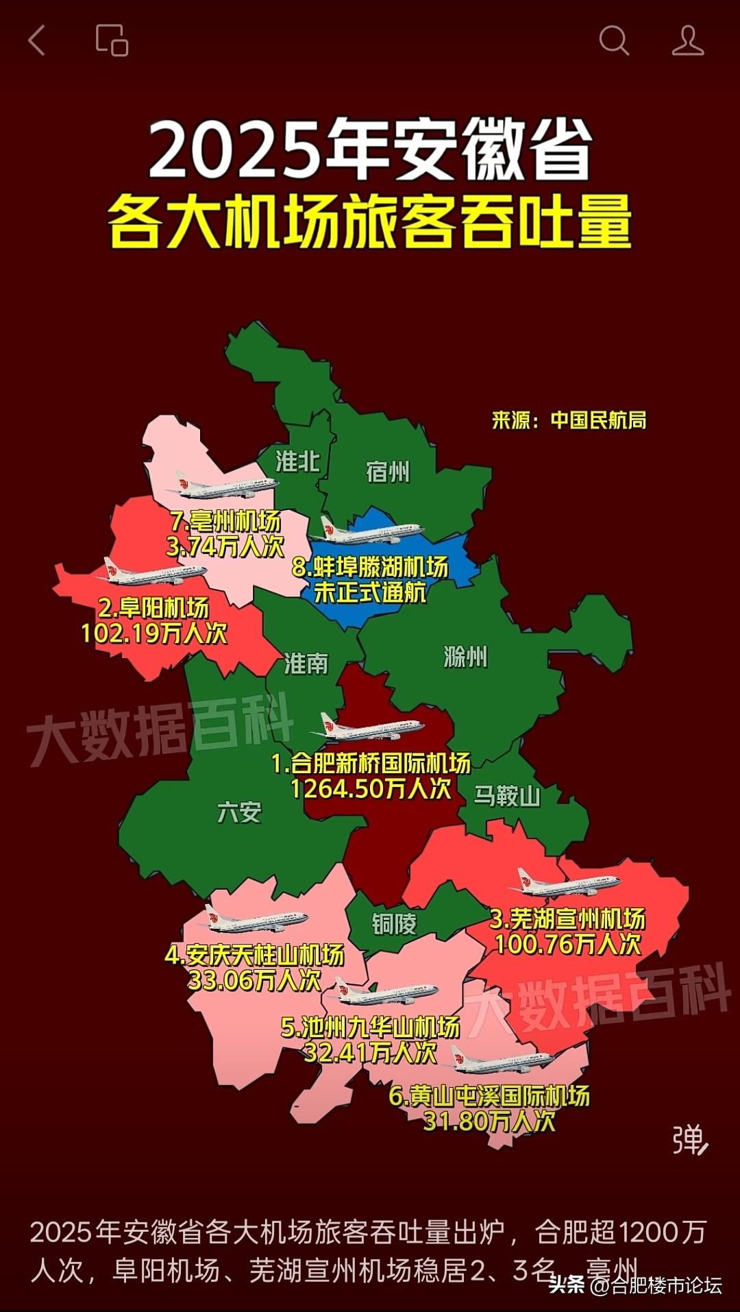 2025年安徽省各机场旅客吞吐量。合肥排第一,不过也才1200万人次,隔壁的南京